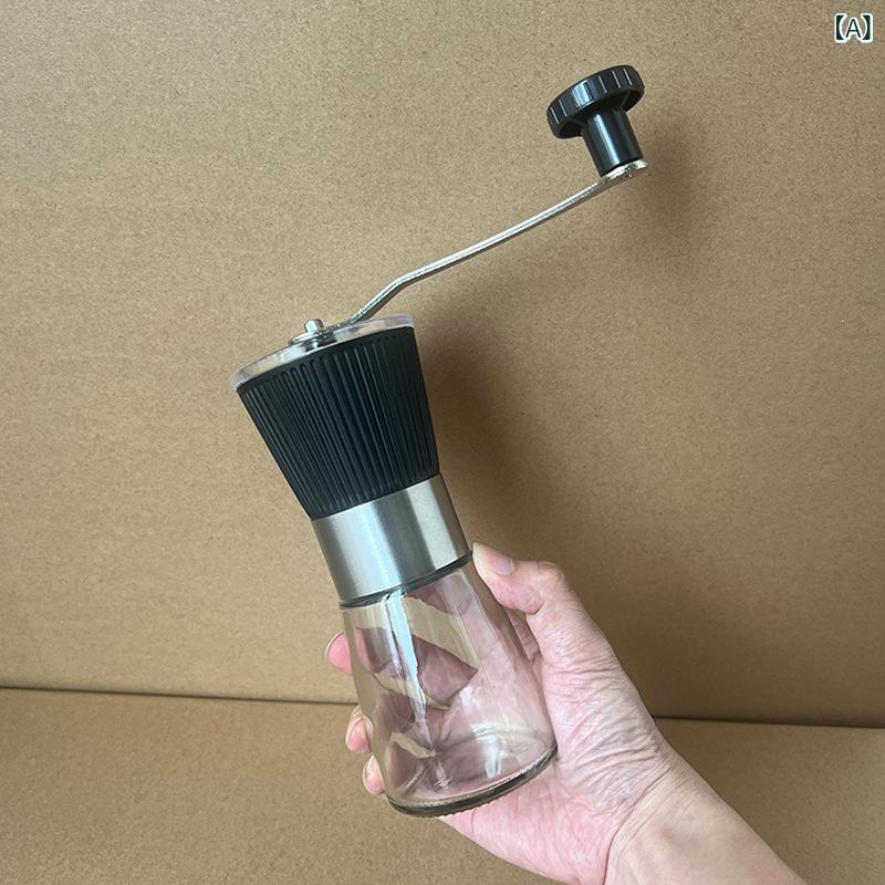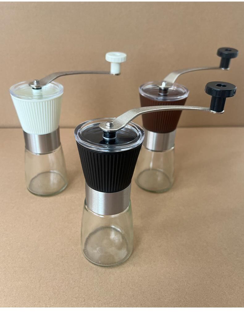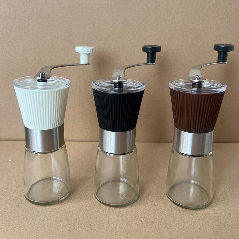 コーヒーミル 手動式 304ステンレス鋼 手挽き コーヒーグラインダー 挽き目調整機能付き 多用途 家庭用 アウトドア キャンプ 旅行 ポータブル コンパクト ガラス製コンテナ シンプルデザイン ブラック ホワイト ブラウン