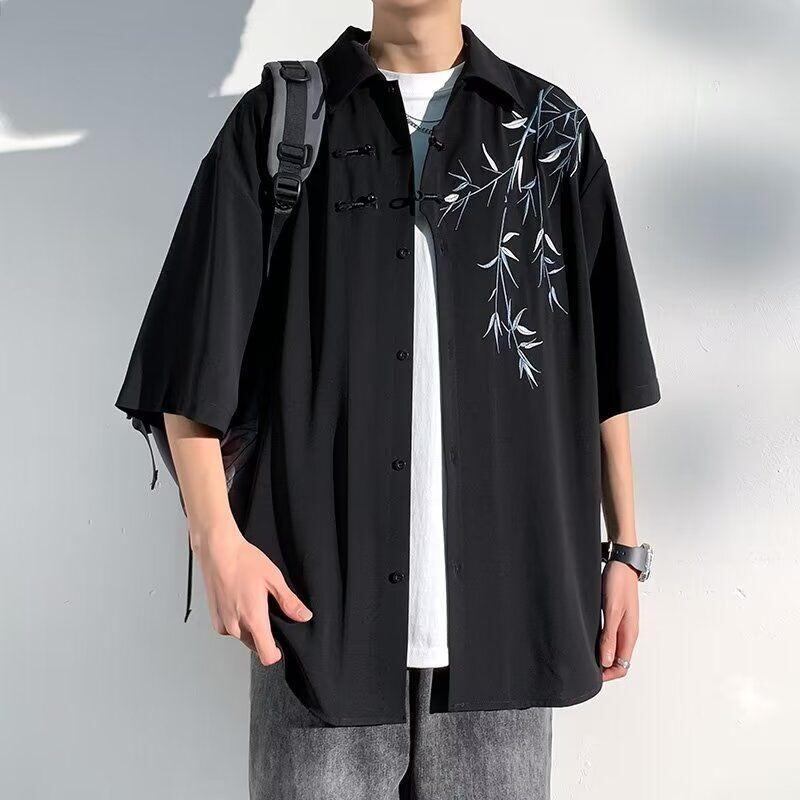 シャツ メンズ 男性用 春夏 カジュアル モダンチャイナスタイル チャイナボタン 刺繡 半袖 唐装 羽織り コーデュロイ ポリエステル 薄手 軽量 角襟 スリムフィット 高級感