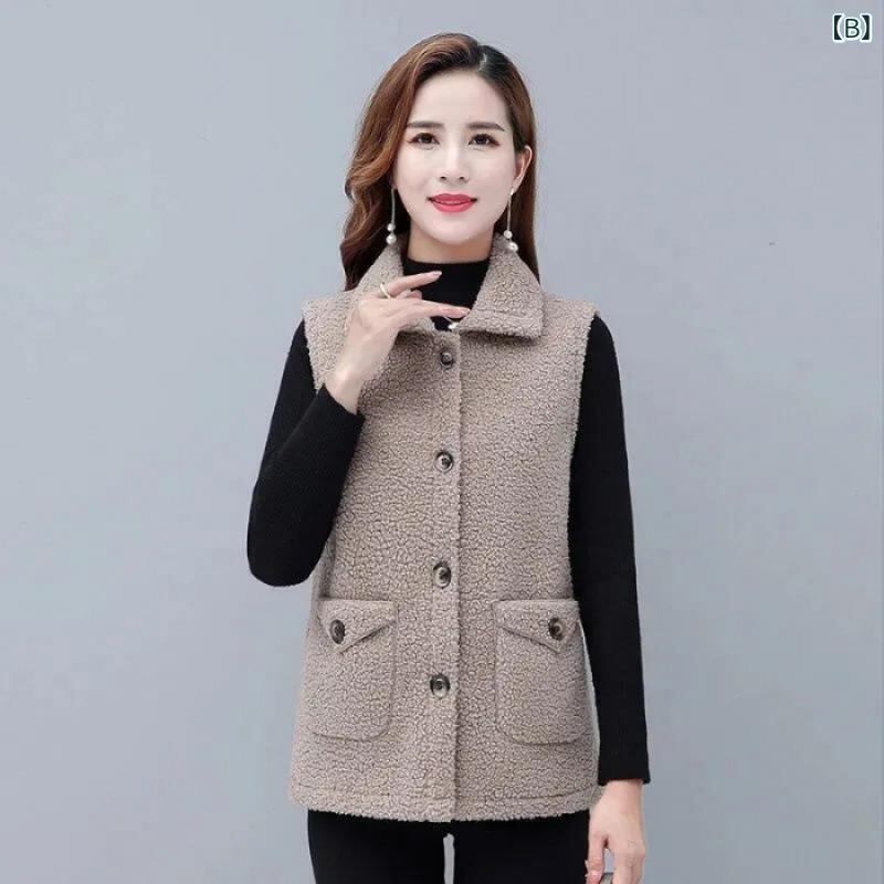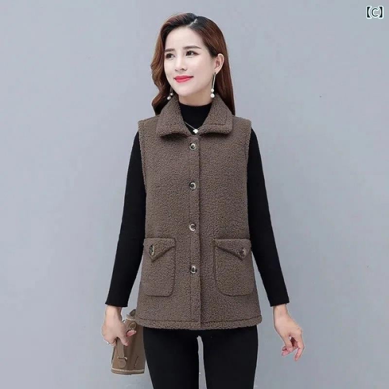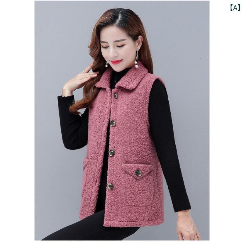 ベスト レディース ミセス 羊毛風 フェイクファー ボア 着回し ミドル丈 ポロ襟 ポケット付き 無地 秋 冬 アウター ピンク カーキ コーヒー 上品 通勤 オフィス カジュアル ボタン付き