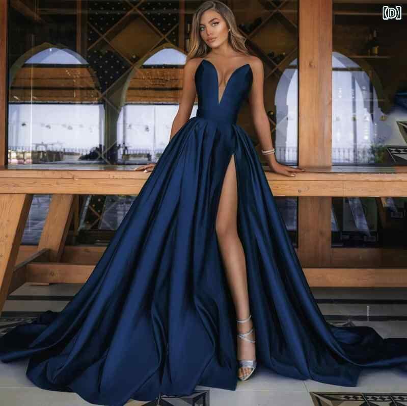 ドレス レディース 深Vネック スリット セクシー ロング丈 ウェディング イブニングドレス フォーマル パーティー お呼ばれ ノースリーブ ミニトレーン ポリエステル レッド グリーン ゴールド ネイビー ブルー