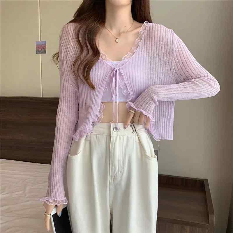 ・カテゴリ: ニット ・スタイル: カーディガン ・テイスト: 韓国風 ・主な素材: ポリエステル ・柄: 無地 ・厚さ: 薄手 ・形式: 単品 ・フィット: スリム ・ネックライン: Vネック ・袖丈: 長袖 ・袖タイプ: レギュラー ・着丈: クロップド丈(約40cm以下) ・デザイン: 紐付き ・加工: ニット ・カラー展開: ブラック、ホワイト、ピンク、パープル ・サイズ: フリーサイズ