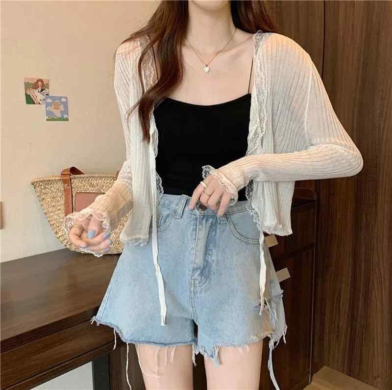 カーディガン レディース ニット ショート丈 羽織り UVカット 日焼け対策 レース Vネック 薄手 軽量 長袖 ポリエステル 接触冷感 着回し ブラック ホワイト ピンク パープル