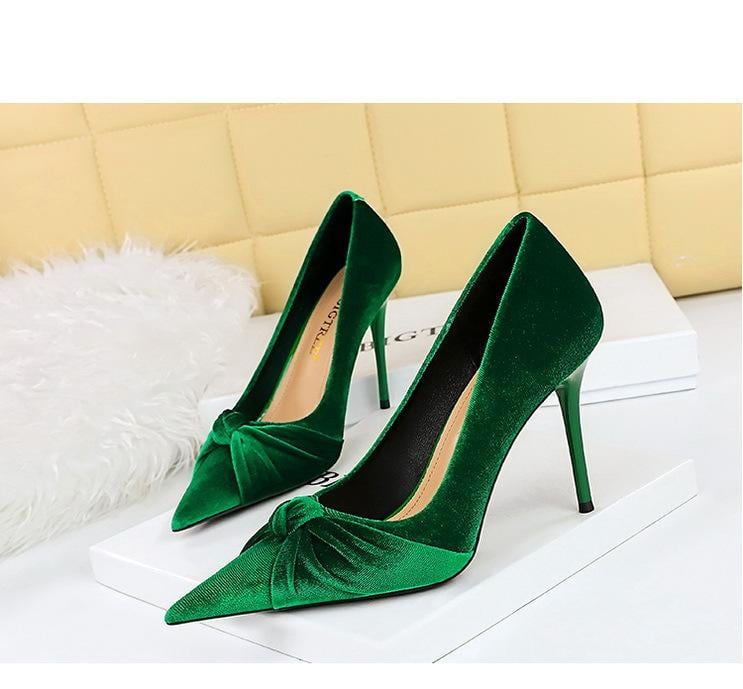 パンプス レディース ポインテッドトゥ 浅口 ハイヒール 細ヒール リボン ベロア 無地 欧米スタイル パーティー フォーマル 春 秋 ラバーソール PUインソール ブラック グリーン アプリコット