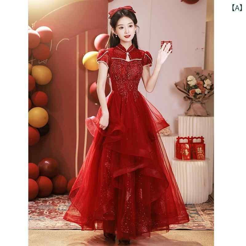 チャイナドレス レディース 新婦 結婚式 披露宴 二次会 お色直し ウェディングドレス パーティードレス イブニングドレス 中国風 高級感 軽やか ロング丈 ハイウエスト 七分袖 ワインレッド