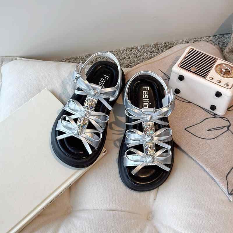 サンダル キッズ 女の子 プリンセスデザイン リボン ビーチ デイリー カジュアル 人工皮革 ゴム底 マジックテープ ワンストラップ アイボリー シルバー 幼児 小学生 中学生