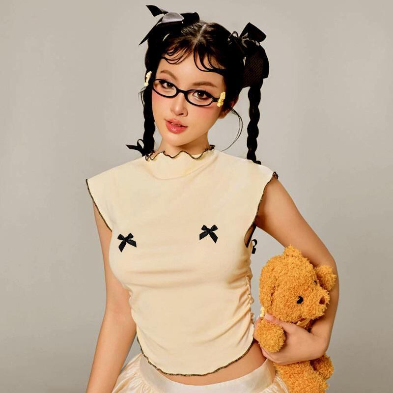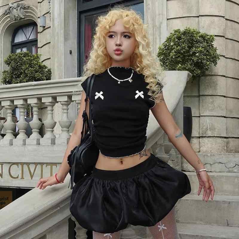 Tシャツ レディース クロップド丈 ドローストリング リボンデザイン 半袖 無地 タイトフィット ハーフネック ポリエステル スパンデックス ストレッチ 夏物 甘辛 セクシー ストリート デイリーユース トップス
