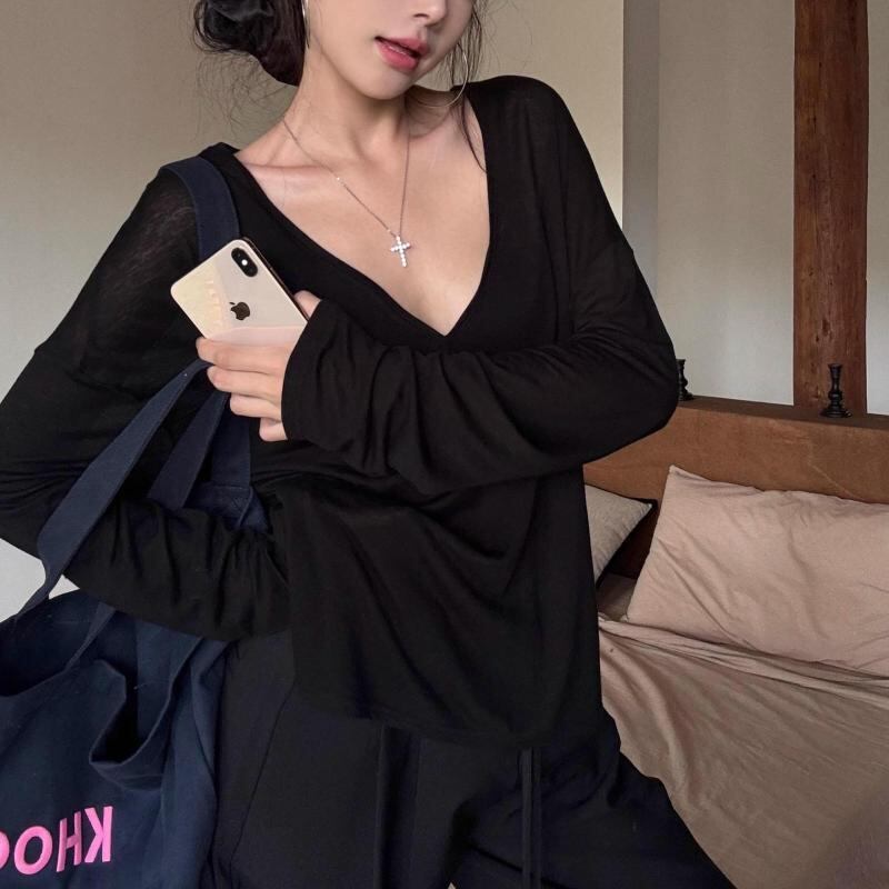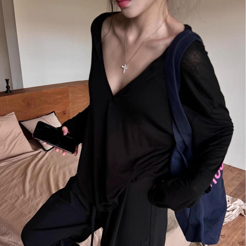 Tシャツ レディース Vネック プルオーバー 長袖 薄手 シアー UVカット 紫外線対策 ポリエステル素材 ゆったり リラックス ルーズシルエット 無地 カジュアル トップス 夏