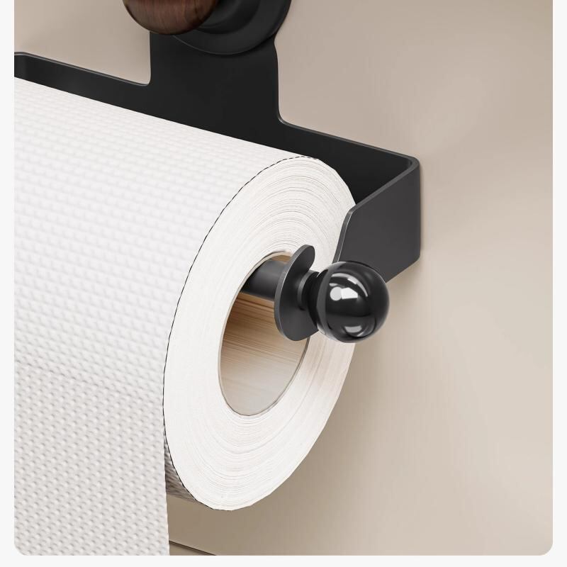 トイレットペーパーホルダー 吸盤式 穴開け不要 壁掛け式 ロールペーパー収納 トイレ バスルーム スチール製 レトロ調 高級感 ウォールナット調 ブナ材調 スクエアデザイン