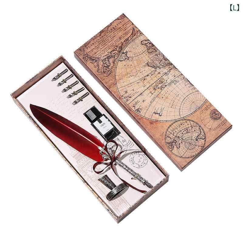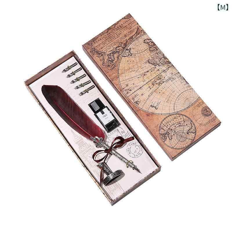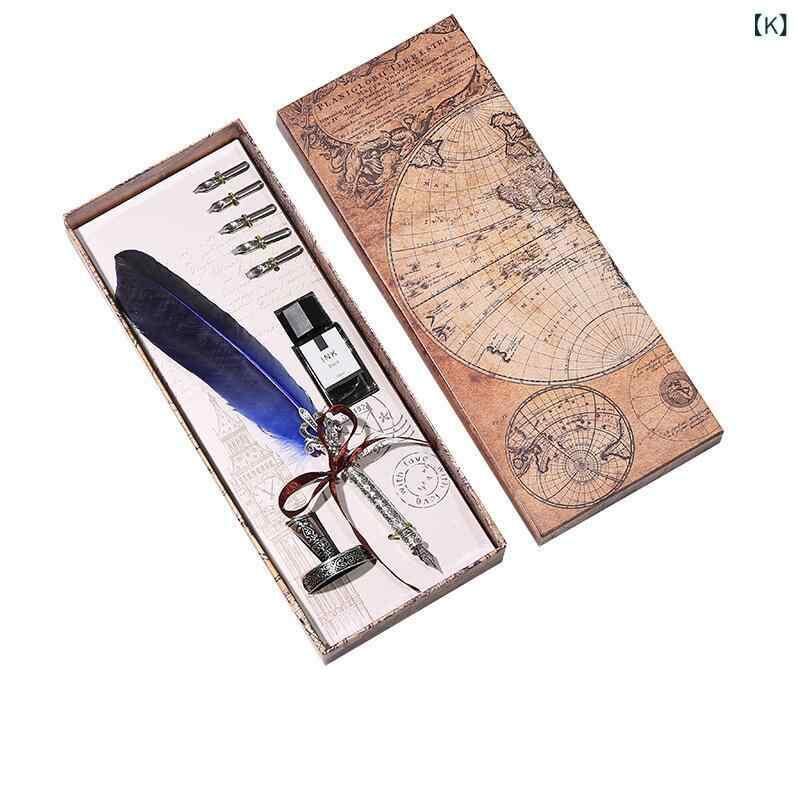・本体素材: 金属 ・構成品: 羽根ペン、インク、ペン先、ペンスタンド ・ロッドカラー: アンティークゴールド、アンティークシルバー ・カラー・デザイン展開: サファイアブルー、レッド、クリムゾンレッド、ワインレッド、レイクブルー、パープル、ブラウン、ラウンドチップグレーフェザー、イエロー、ネイビー、ダークグリーン