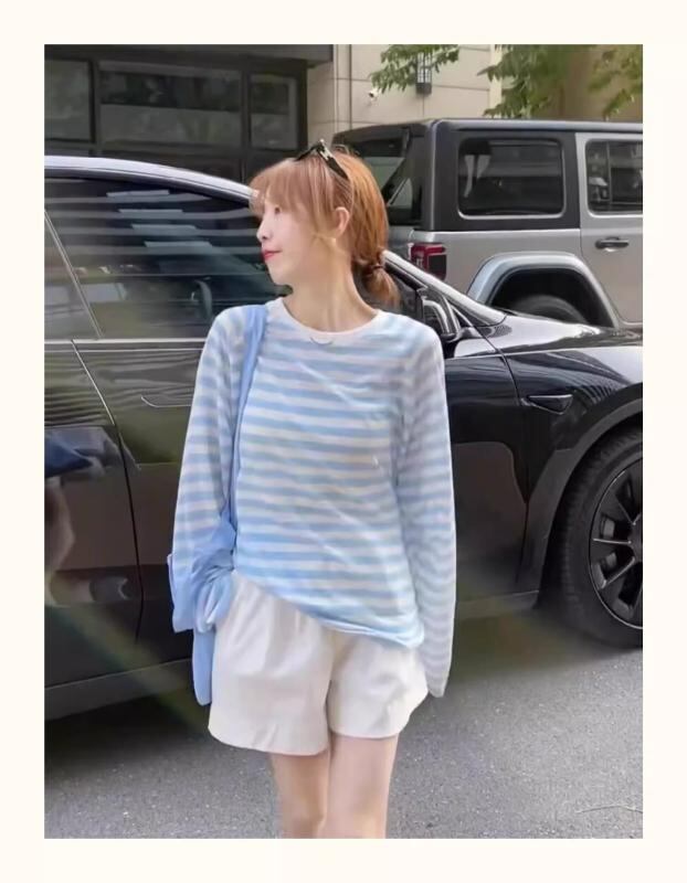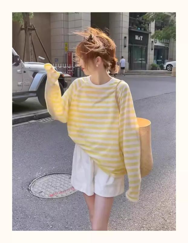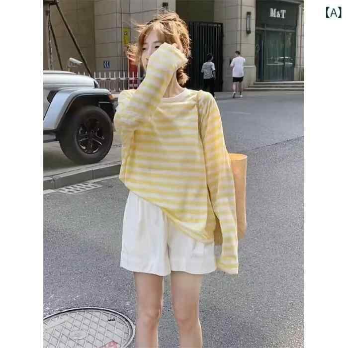 Tシャツ レディース 女性用 配色 ストライプ柄 長袖 ロングスリーブ ゆったり ルーズシルエット 薄手 軽量 接触冷感 UVカット ラウンドネック ミドル丈 カジュアル 普段使い ルームウェア トップス イエロー系 ブルー系