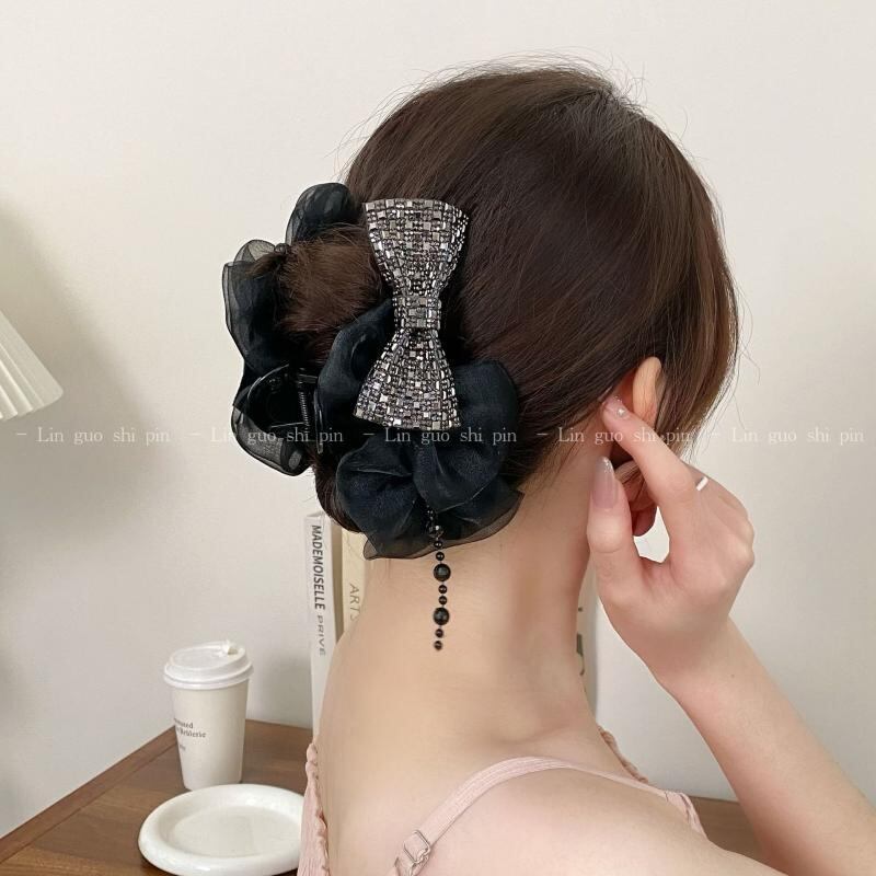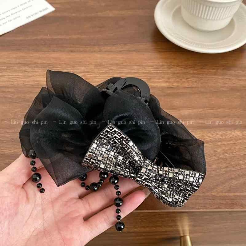ヘアクリップ レディース 大きめサイズ ボリュームアップ 蝶々結び リボン パールチェーン タッセル メッシュ素材 ブラック 黒 バンスクリップ 髪留め シャーククリップ まとめ髪 韓国風 ハンドメイド 後頭部 ヘアアレンジ 13cm