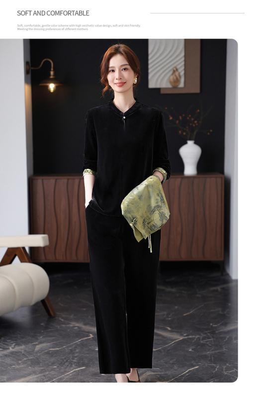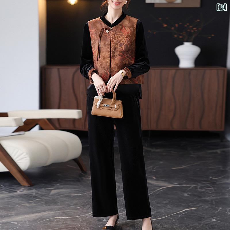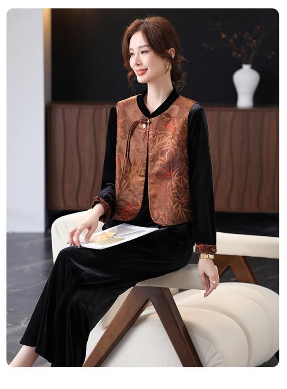 アンサンブル ミセス 女性 中高年向け スリーピース 春秋 ベスト ジャケット ロングパンツ ベロア調 光沢感 ポリエステル素材 ゆったり 快適 中厚手 チャイナ風 上品 おしゃれ 普段使い お出かけ プリント柄