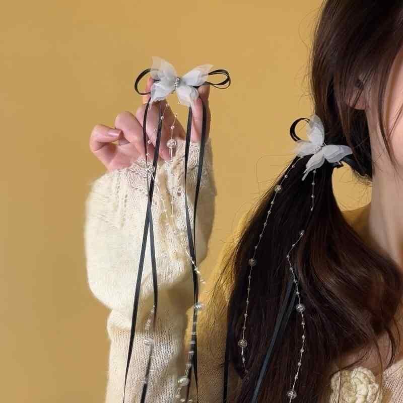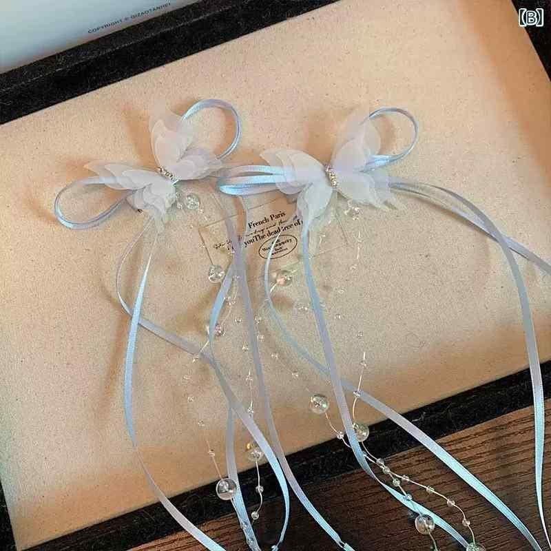 ヘアクリップ レディース ドリーミー フレンチレトロ バレエモチーフ リボン 蝶々 パールチェーン ロングタッセル かわいい サイドクリップ 布製 ハンドメイド