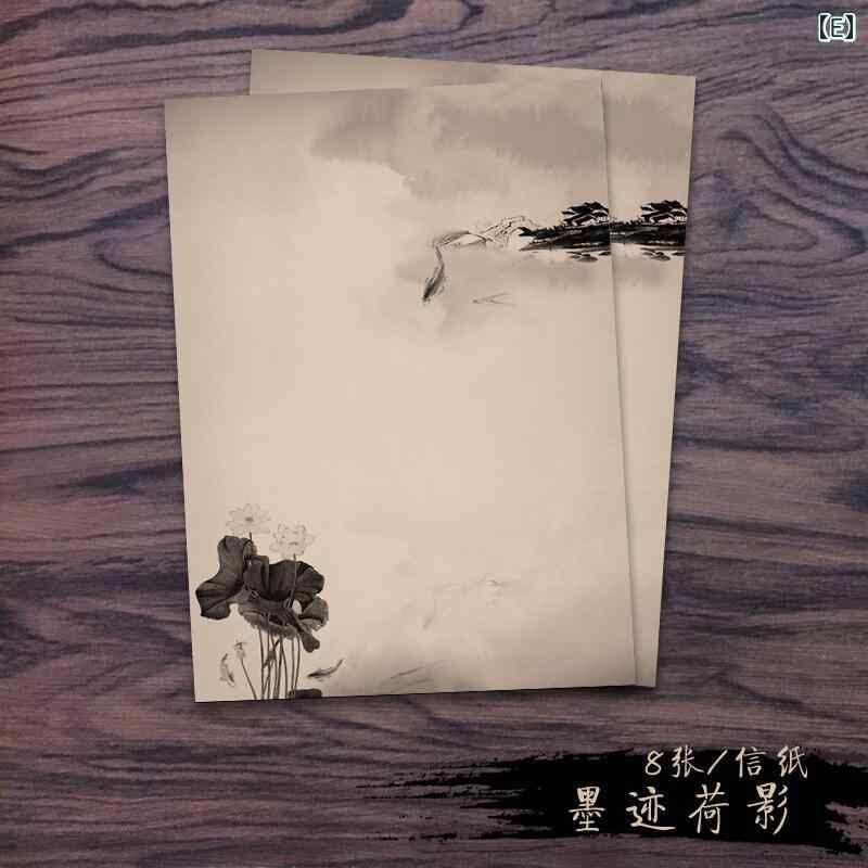 レターセット 中国風 レトロ アンティーク調 便箋 封筒 クラフト紙 縦書き 山水画 蓮 梅 墨絵デザイン メッセージカード おしゃれ 文房具 大人