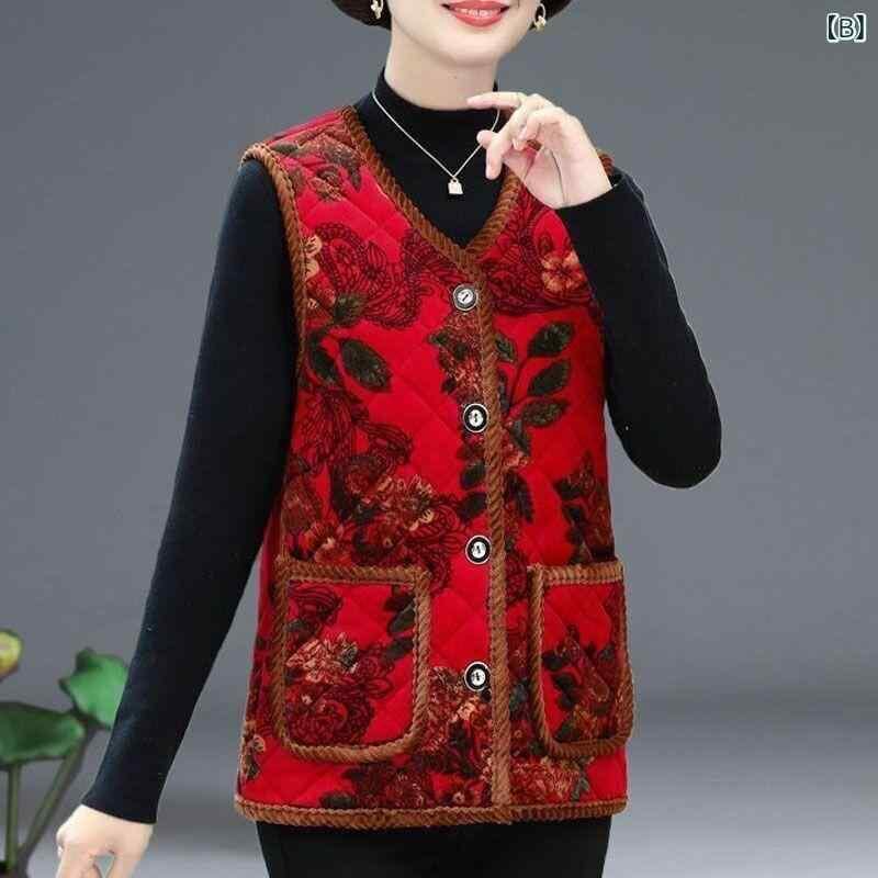 ベスト レディース シニア ミセス お母さん ポリエステル 裏起毛 中綿入り 厚手 防寒 あったか 前開き クルーネック 花柄 ゆったり 体型カバー 冬物 アウター 普段使い お出かけ カジュアル