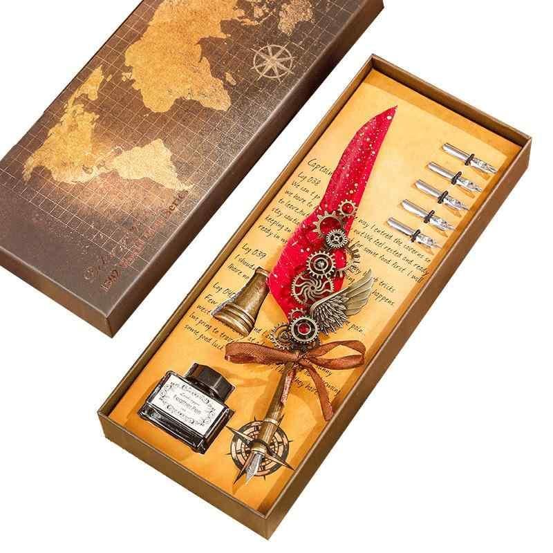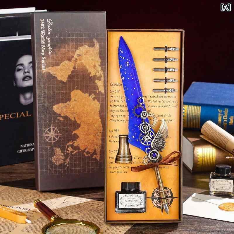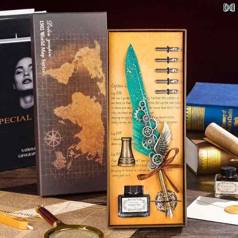 筆記具セット 羽ペン つけペン 万年筆 ボールペン ゴールド羽根デザイン 歯車モチーフ アンティーク調 メタル製 ギフトボックス入り 書斎 デスク 記念品 贈答品 プレゼント