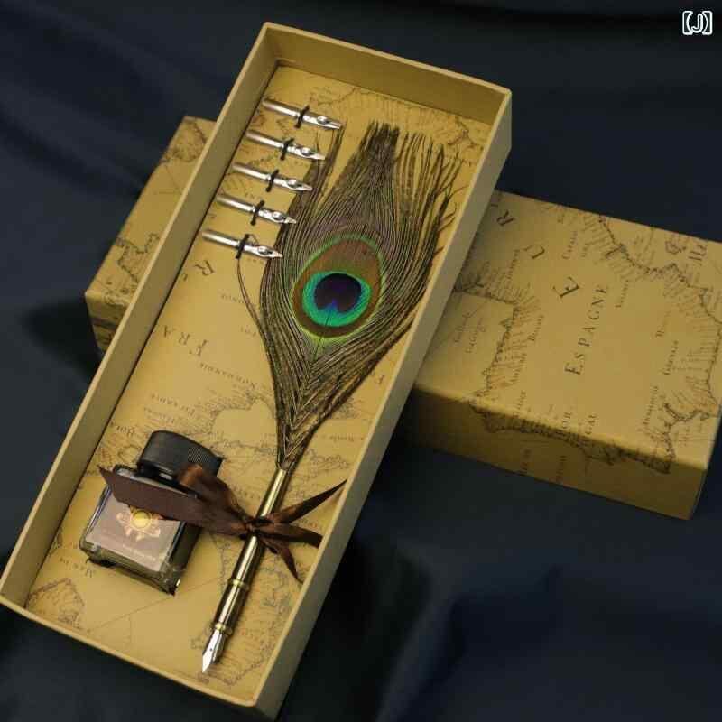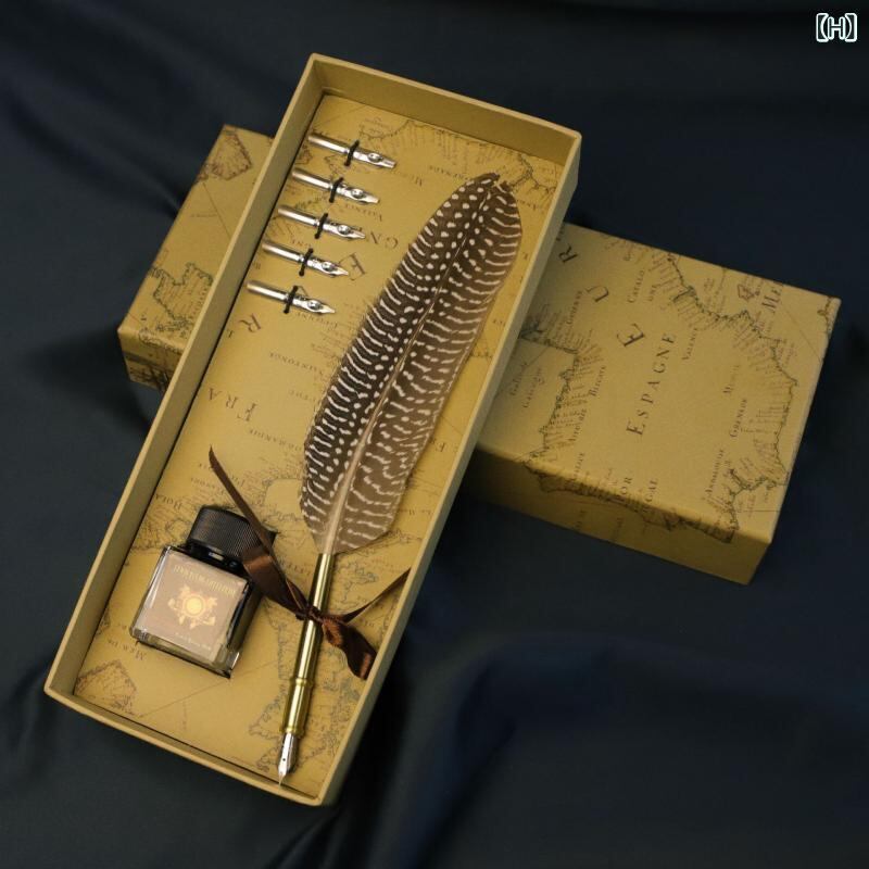 羽根ペン 付けペン 欧風 レトロ アンティーク調 ゴールド 筆記具セット 孔雀羽根 ガチョウ羽根 木製ハンドル ステンレスペン先 地図ボックス入り ギフト 豪華 書斎 デスク