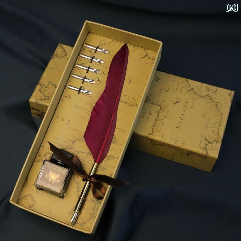 ・インク供給方式: 付けペン式 ・ペン先: 付けペン用ステンレス ・種類展開: 紅木色木軸セット、原木色木軸セット、ゴールドガチョウ羽根セット、ゴールド七面鳥羽根セット、金縁大型羽根セット、フクロウ羽根セット、シルバーチキン羽根セット、ホロホロチョウ羽根セット、七面鳥尾羽根セット、孔雀羽根セット、グレーガチョウ羽根セット、ホワイトガチョウ羽根セット、ワインレッドガチョウ羽根セット、ブラウンガチョウ羽根セット、ブラックガチョウ羽根セット、ダークブルーガチョウ羽根セット ・付属インク色: ブラック ・インク特性: 消去不可