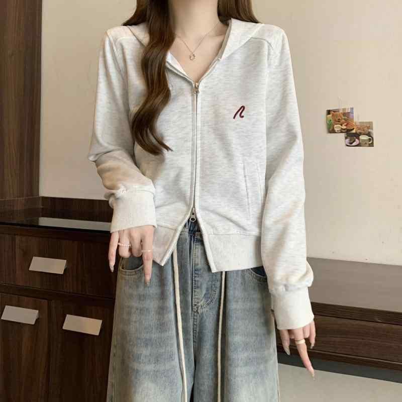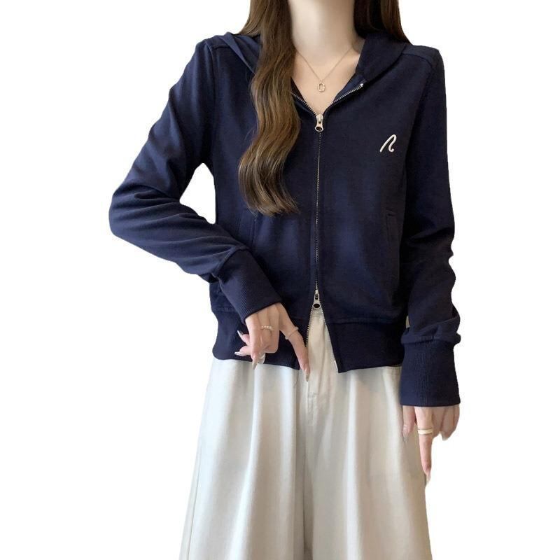 スウェットパーカー レディース 刺繍 ロゴ ジップアップ カーディガン フード付き 長袖 薄手 ショート丈 スリムフィット ポケット付き コットンブレンド ポリエステル ホワイトグレー ダークブルー カジュアル 通勤 トップス アウター