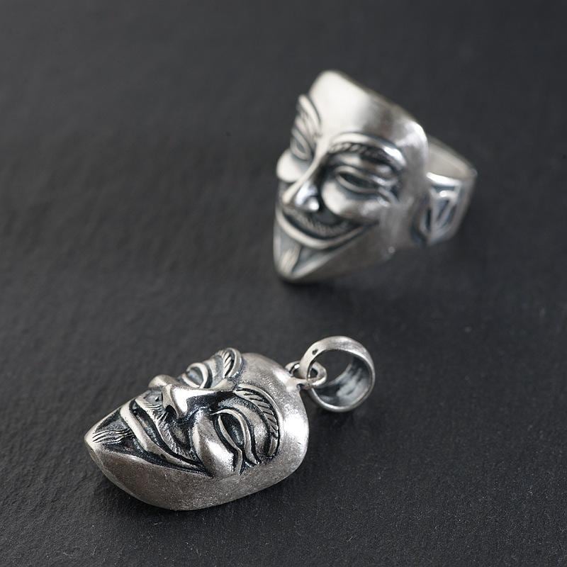 アクセサリー メンズ 純銀 シルバー990 レトロ ヴィンテージ タイ銀細工 ペンダント ネックレス リング 指輪 セット 仮面モチーフ スカル ドクロ