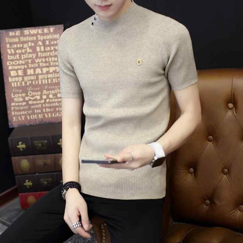 ニット メンズ 半袖 スリムフィット 韓国風 モックネック ハーフネック セーター 伸縮性 薄手 綿混 ポリエステル シワになりにくい イージーケア 普段使い カジュアル オールシーズン ベージュ レッド ダークブルー 紺 ブラック 黒 | cybercart