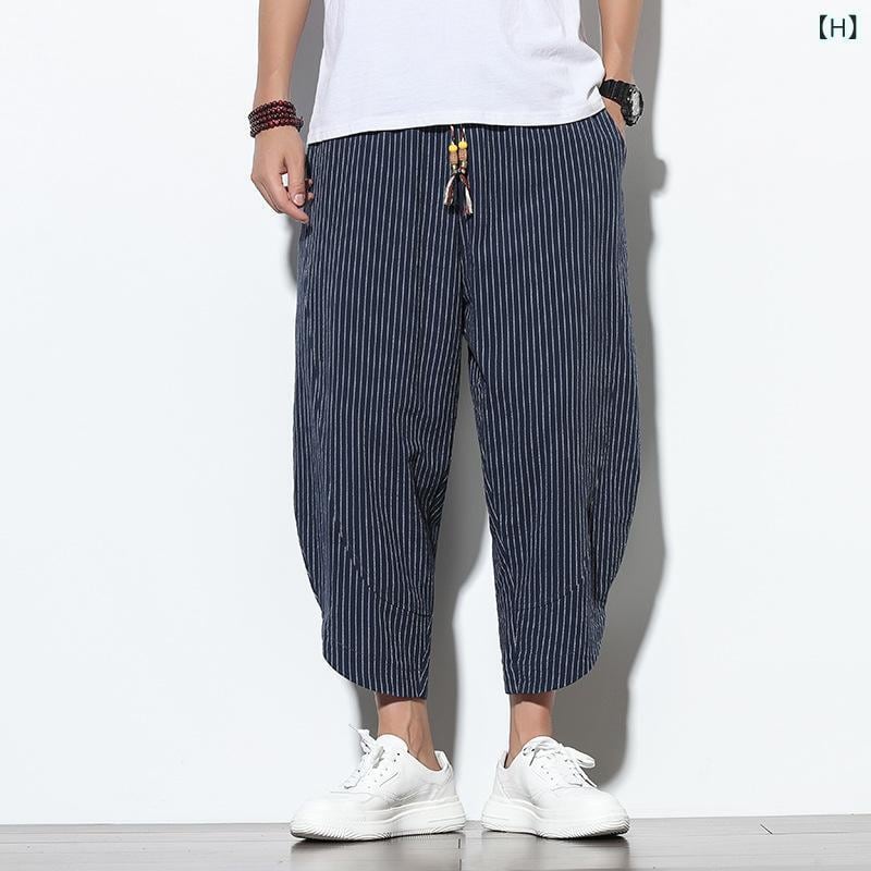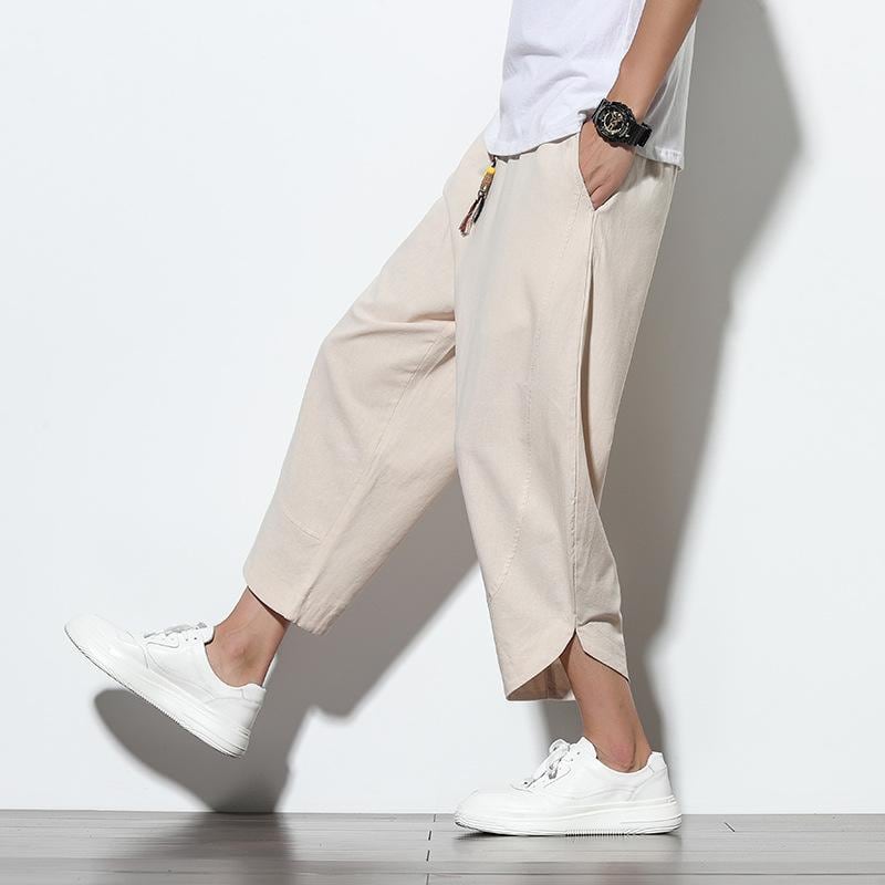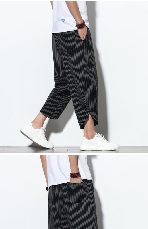 パンツ メンズ 男性用 接触冷感 綿麻 コットンリネン 七分丈 クロップドパンツ 中国風 チャイナ風 カジュアル イージーパンツ ゆったり ルーズフィット ワイドシルエット 大きいサイズ ビッグサイズ カーキ グレー ブラック