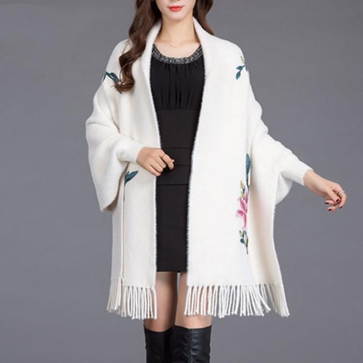 ポンチョ ケープ レディース 袖付き 厚手 ニットカーディガン フェイクミンク アウター 秋冬 保温 旗袍風 ミドル丈 花柄 クロシェ編み 日韓風 フェミニン レッド ブラック ホワイト