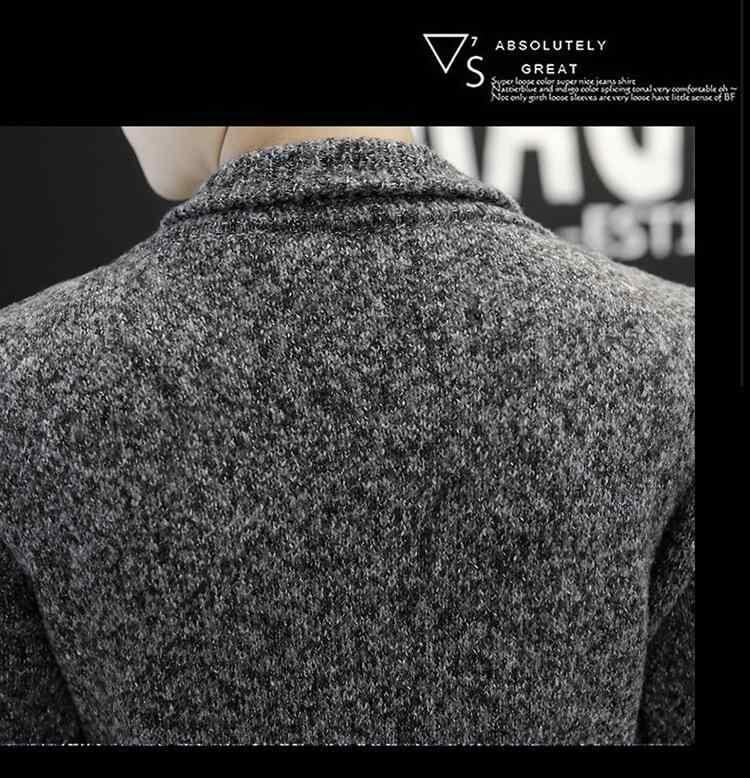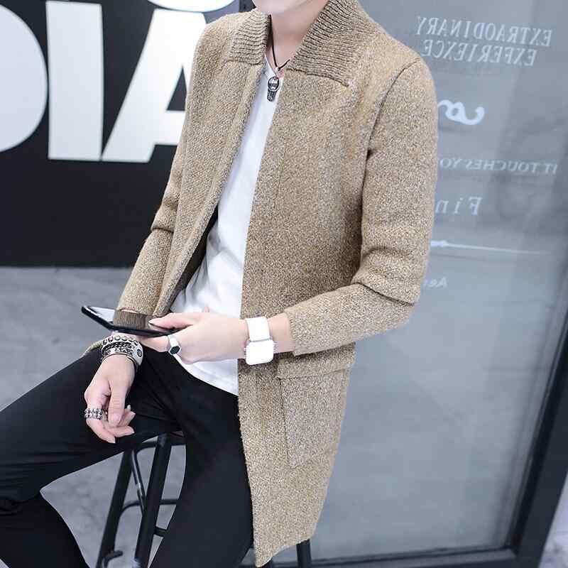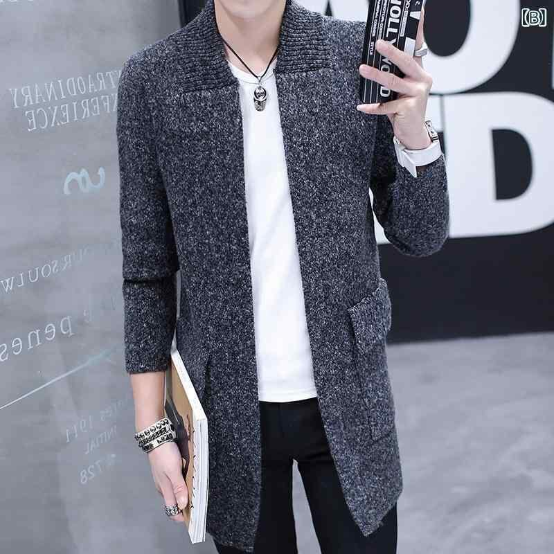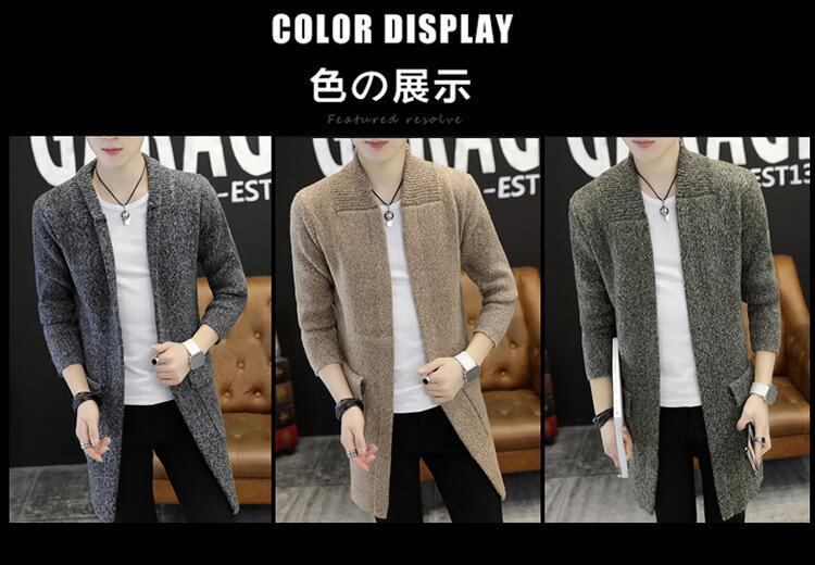 カーディガン メンズ 男性用 秋 ミドル丈 厚手 スリムフィット 襟付き ラペル ニット アウター ポリエステル混紡 カジュアル 普段使い 韓国風 シワになりにくい カーキ グレー グリーン