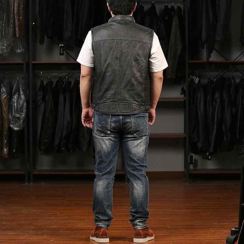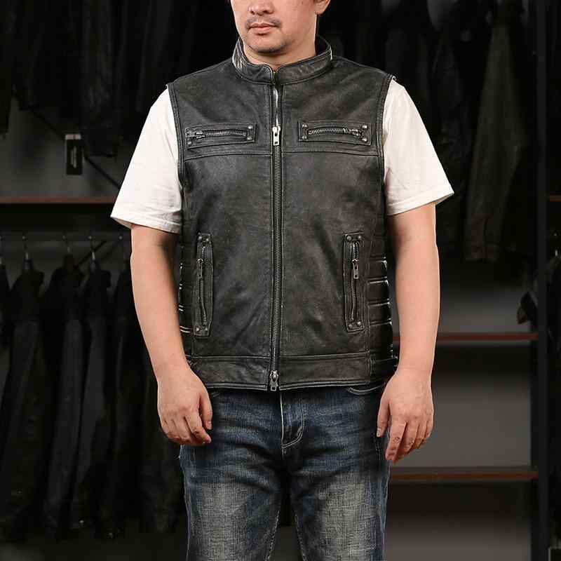 ベスト メンズ 牛革 本革 レザー スタンドカラー ライダース バイカー ロック カジュアル ヴィンテージ加工 レトロ加工 スリムフィット 多ポケット ブラック ブラウン