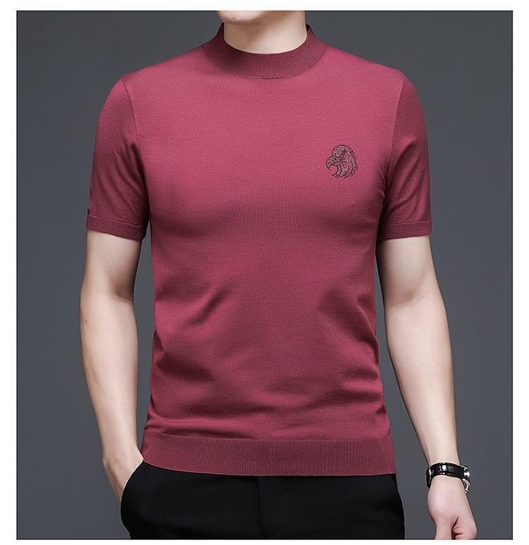 ニットTシャツ メンズ 半袖 モックネック イーグル ラインストーン アクリル スリムフィット 韓国風 カジュアル 春秋 普段使い 通気性 プルオーバー トップス