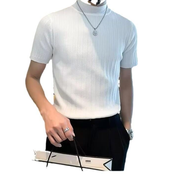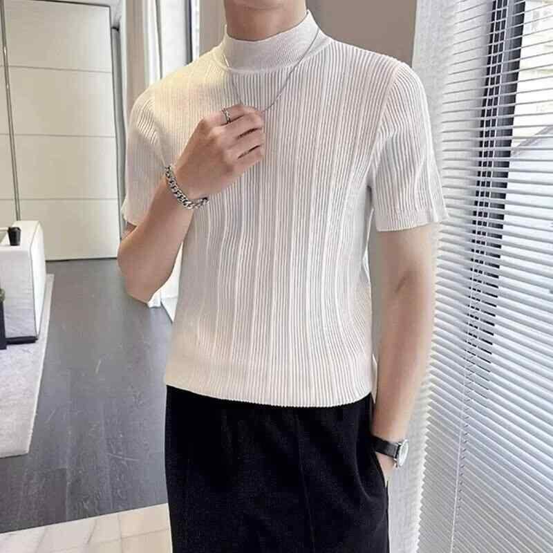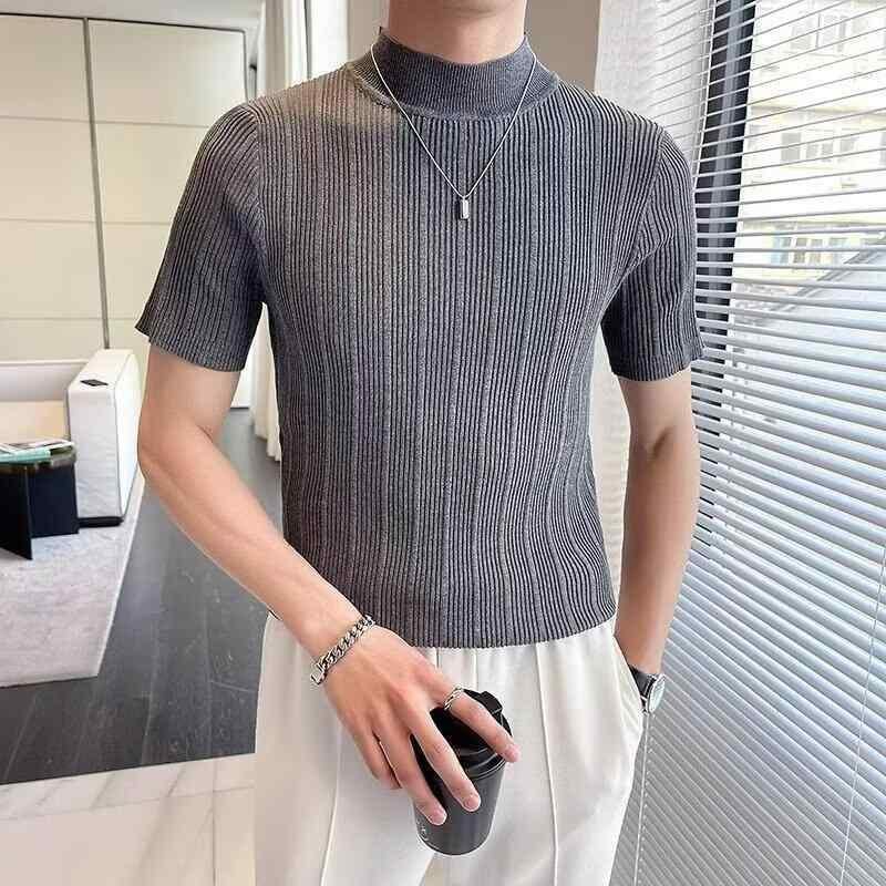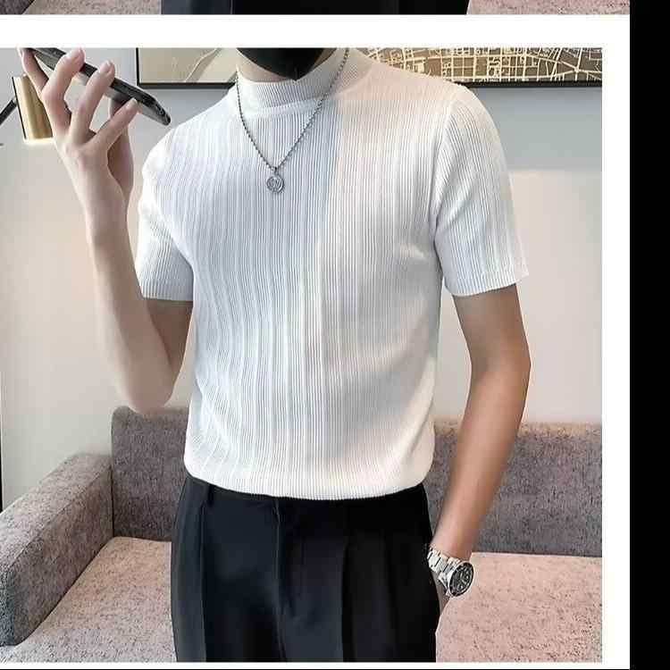 ニット メンズ 半袖 モックネック Tシャツ トップス カットソー インナー スリムフィット 細身 ストレッチ 伸縮性 韓国カジュアル トレンド 普段使い ラビットファー ウォッシャブル グレー ホワイト ブラック 夏服