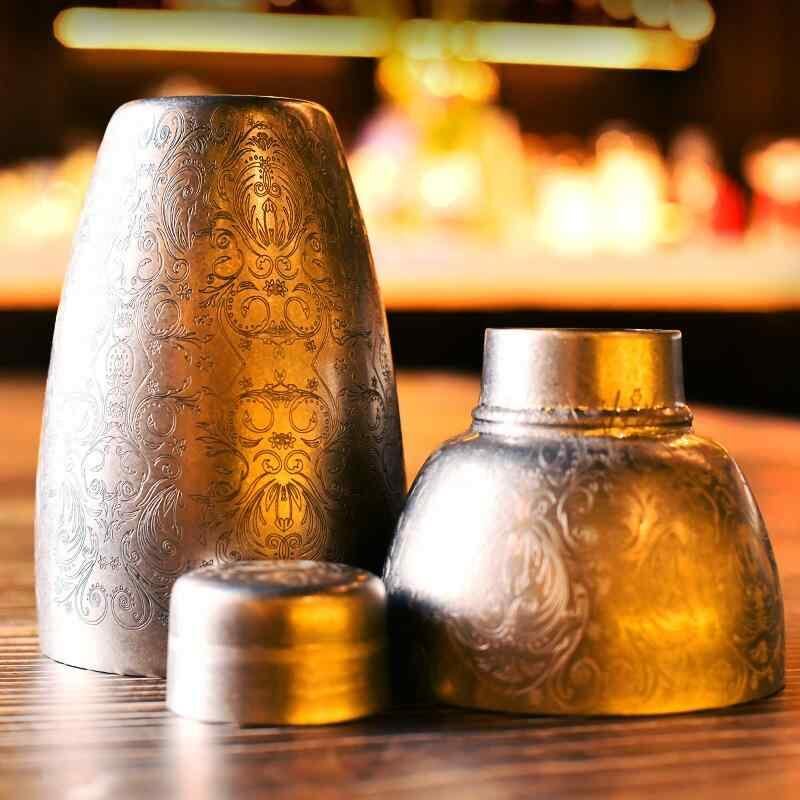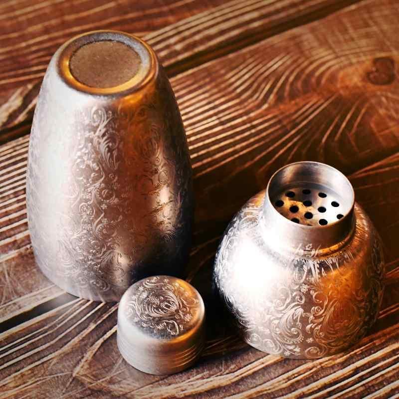 カクテルシェイカー ステンレス製 和風 レトロ アンティーク調 エッチング刻印 3ピース構造 ライトラグジュアリー 高級感 バー プロ仕様 自宅用 カクテルミキサー マット仕上げ 光沢 ゴールドカラー