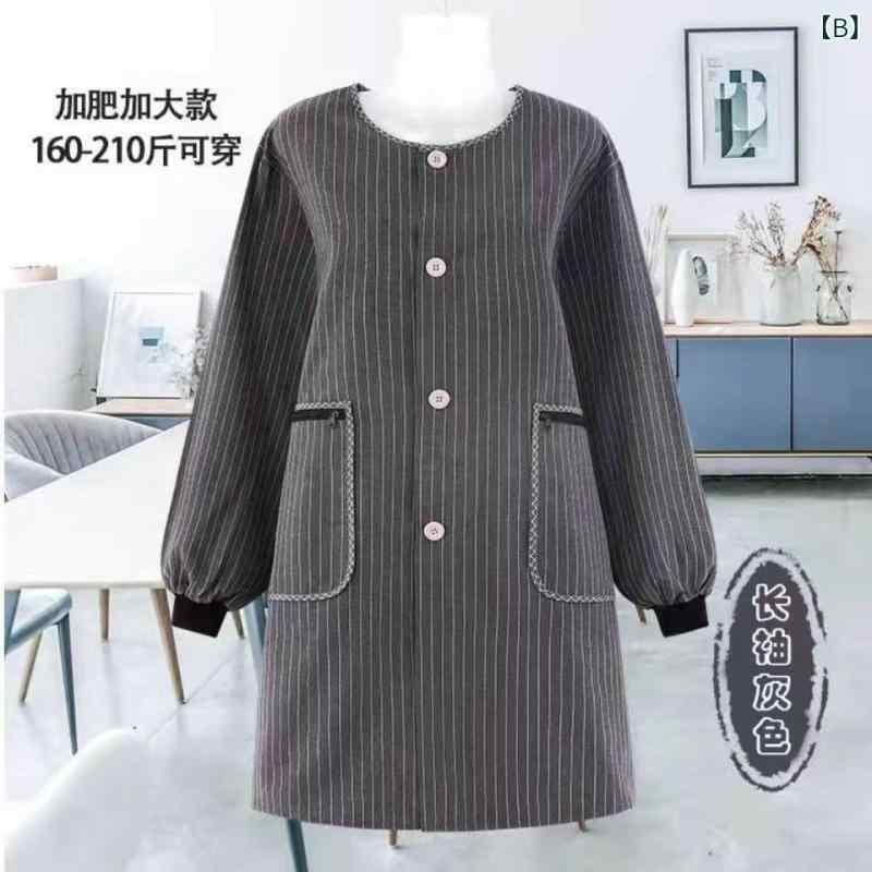 エプロン レディース 大きいサイズ ビッグサイズ ぽっちゃりさん向け 防汚 撥水 長袖 ゆったり スモック 割烹着 綿 コットン 家事 仕事 料理 作業着 体型カバー ストライプ柄 シンプル モダンデザイン