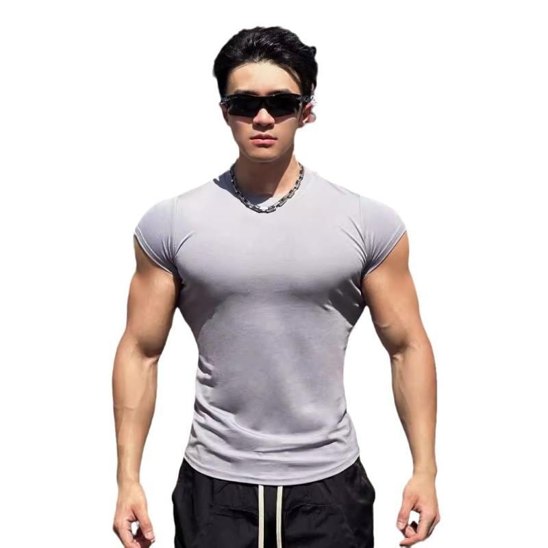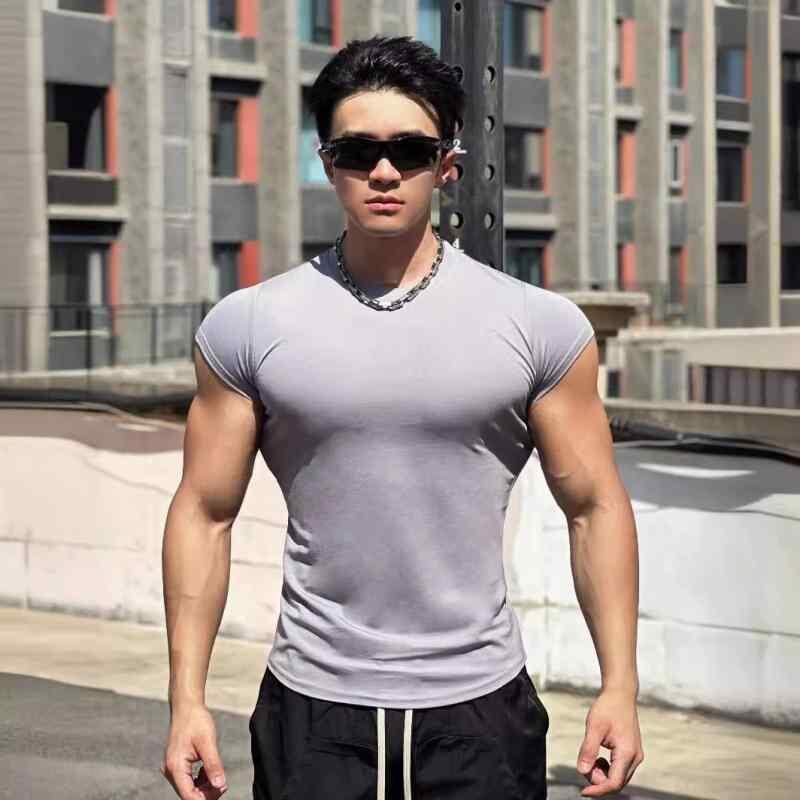 Tシャツ メンズ 夏 スポーツ フィットネス トレーニング マッスル 半袖 クルーネック 丸首 スリム ストレッチ 通気性 吸湿速乾 防しわ 薄手 綿混 高伸縮性 無地