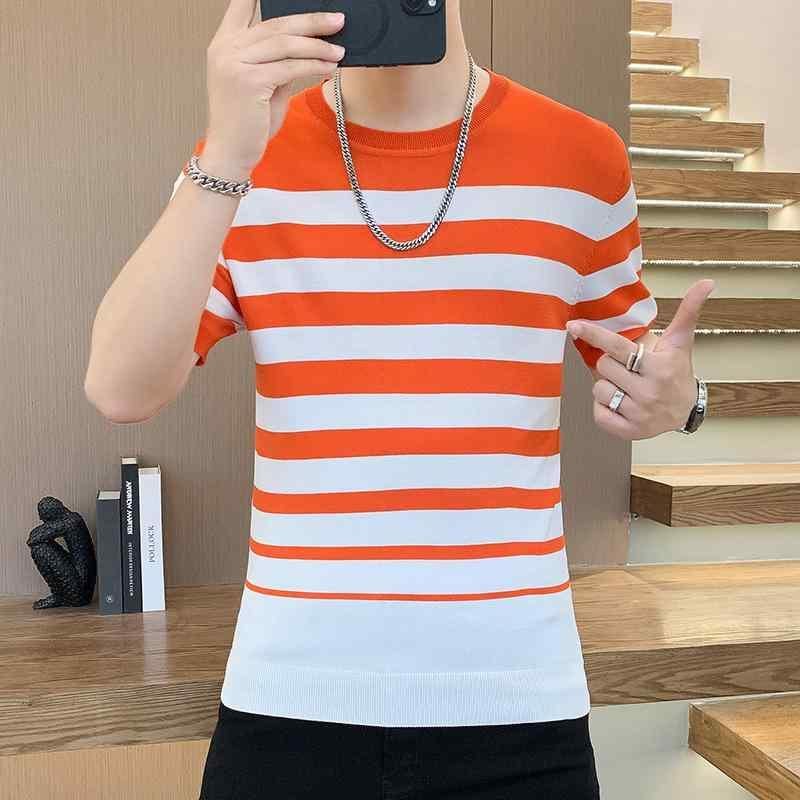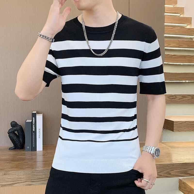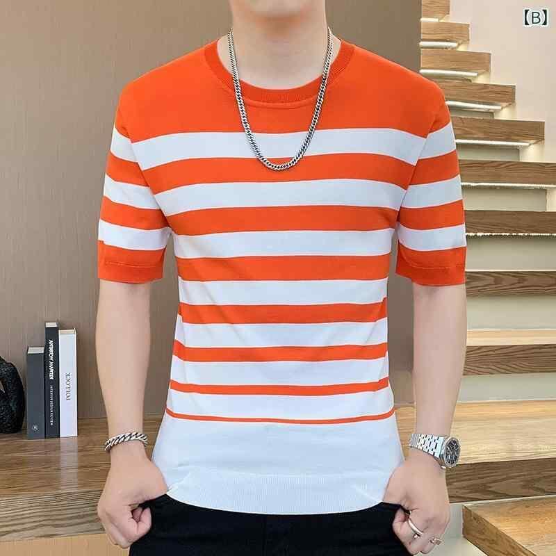 Tシャツ メンズ 夏 半袖 薄手 ゆったり プルオーバー クルーネック 丸首 ジャカード 織り柄 ストライプ ボーダー 接触冷感 ストレッチ 伸縮性 ニット
