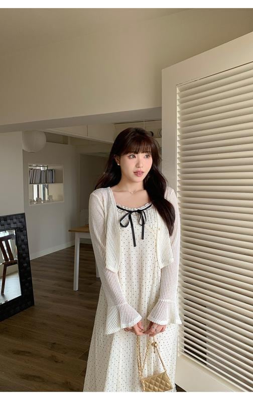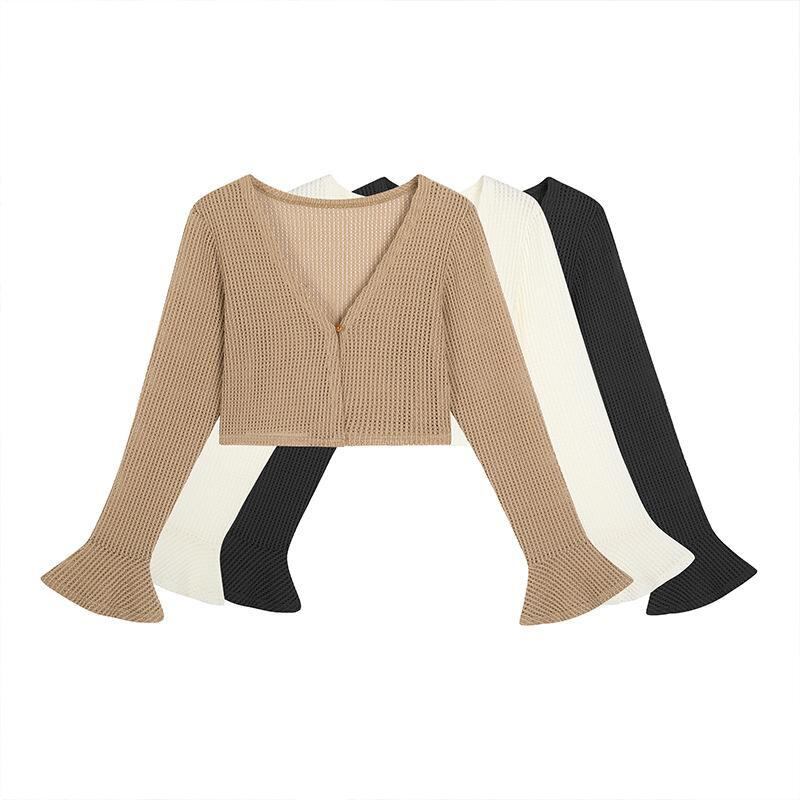 カーディガン レディース ショート丈 透かし編み 長袖 Vネック UV対策 大きいサイズ ゆったり ポリエステル ニット 羽織り フェミニン エレガント アプリコット ブラック グレージュ