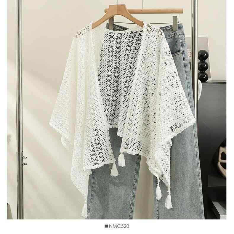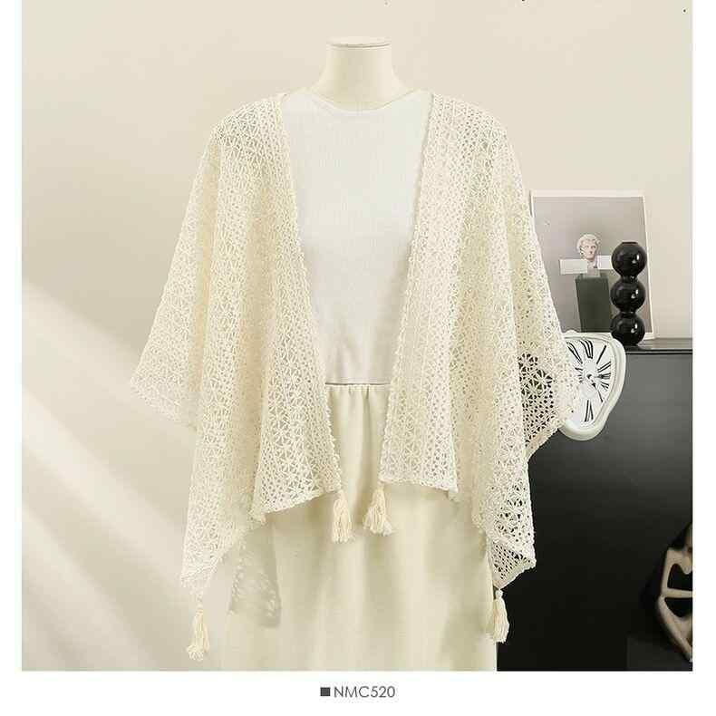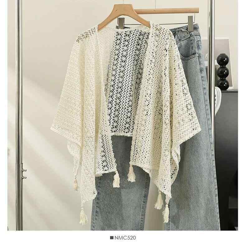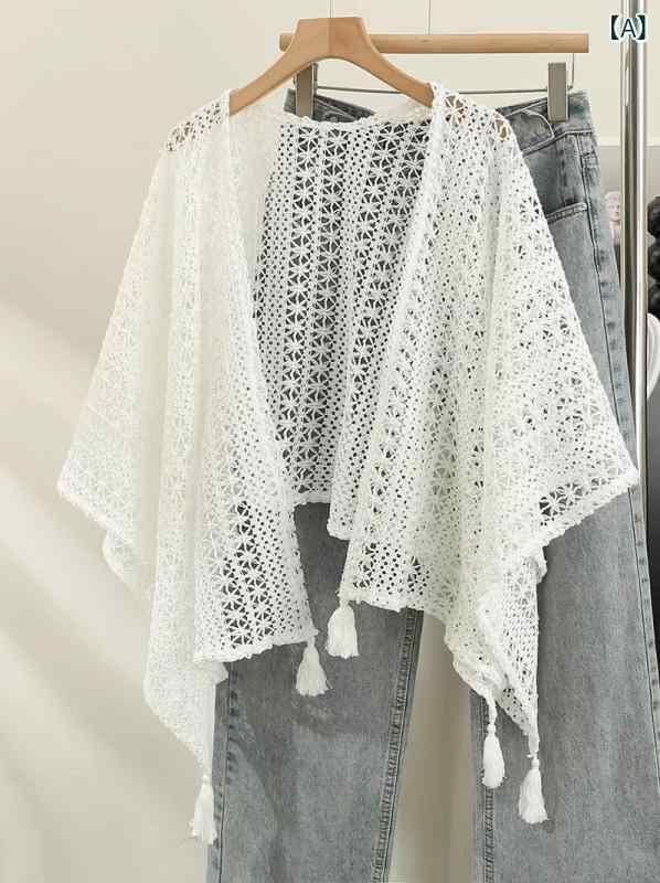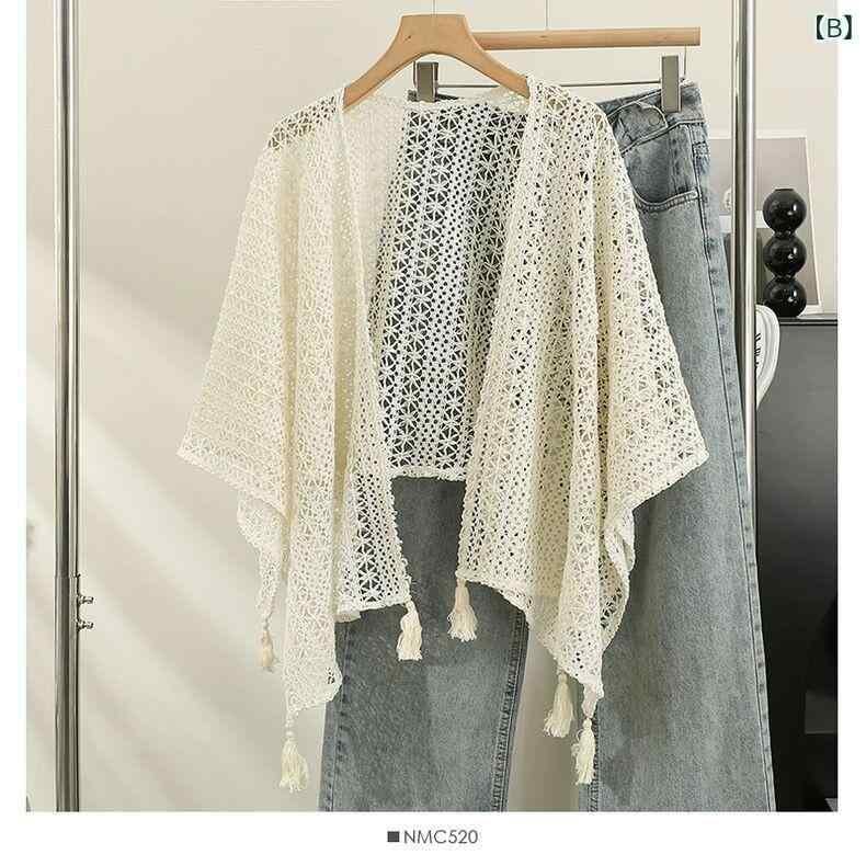 ショール レディース レトロ エスニック 薄手 透かし編み レース フリンジ ショート丈 カーディガン 春夏 旅行 リゾート 羽織り ポリエステル ホワイト ベージュ