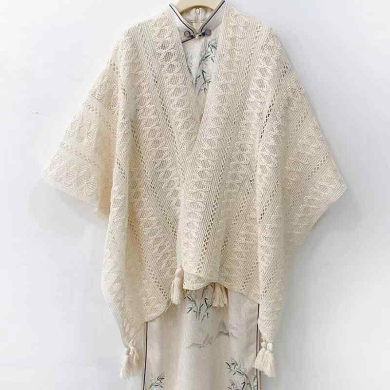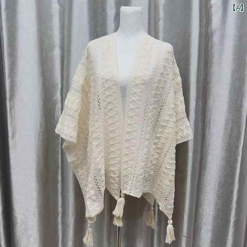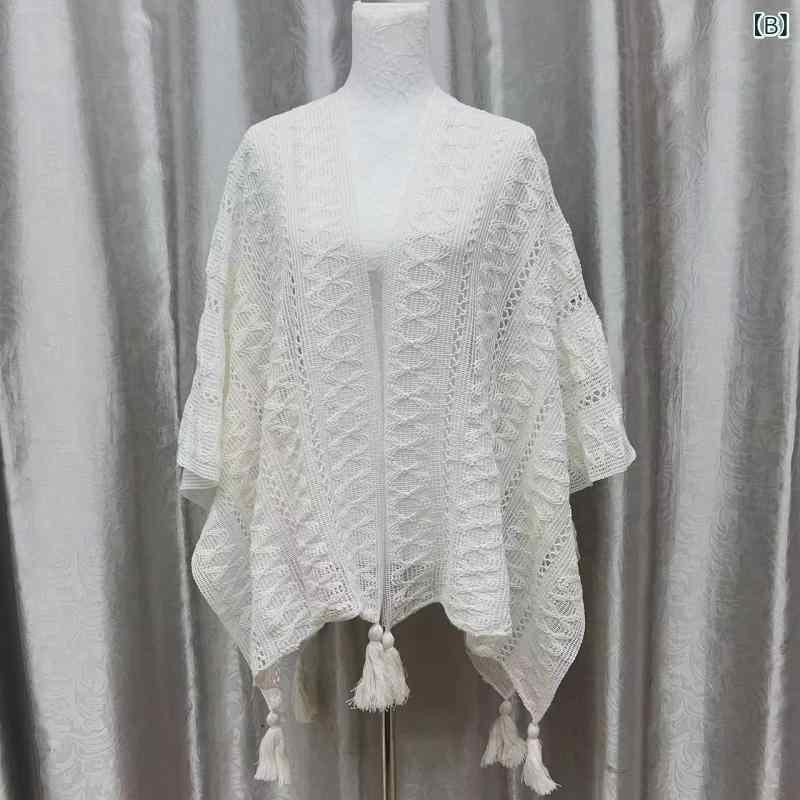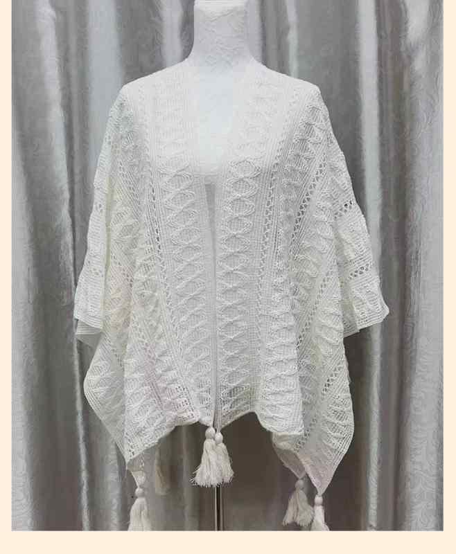 披肩 レディース 単色 透かし編み ニット 羽織り ポンチョ ストール フリンジ スリットデザイン エレガント 上品 旅行 トラベル 綿 コットン 春秋 秋冬 普段使い オフィス 体型カバー 冷房対策 ベージュ ホワイト