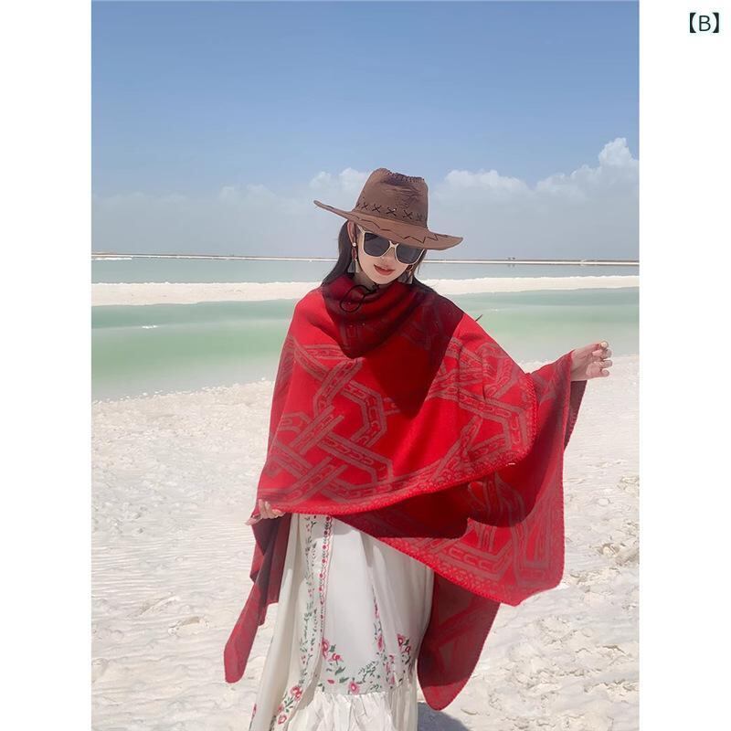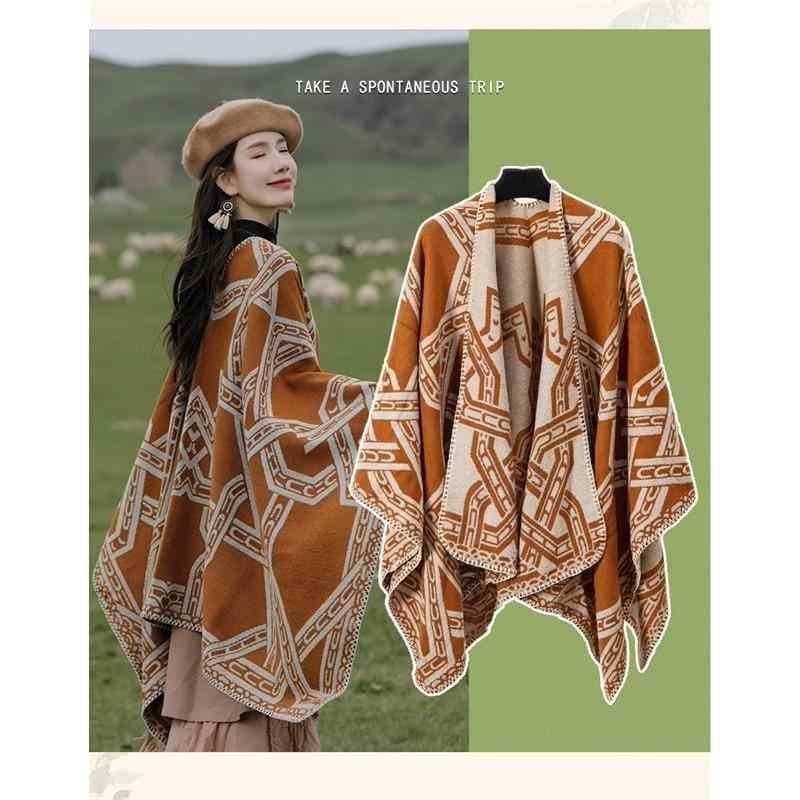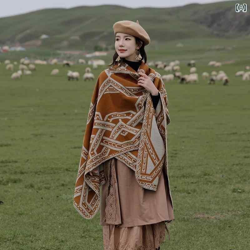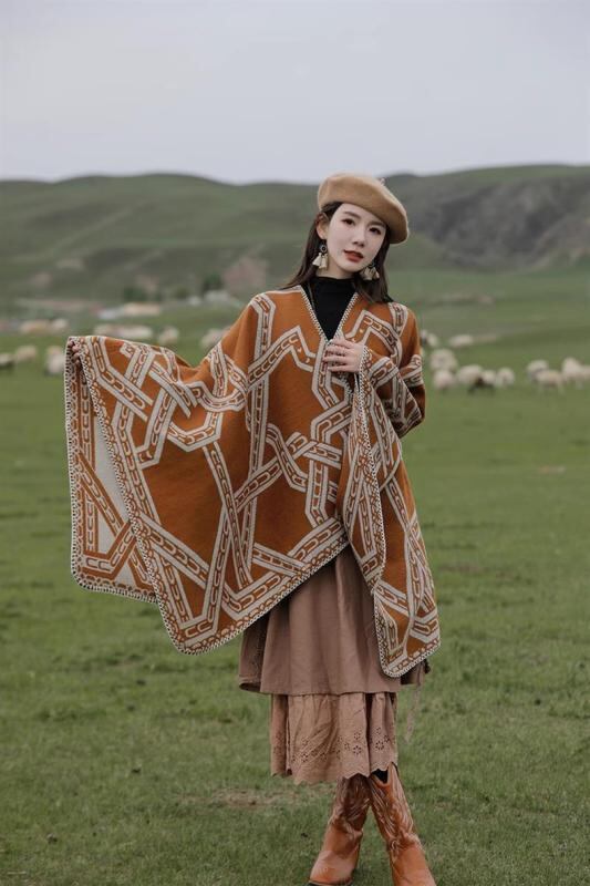ポンチョ 男女兼用 フード付き レトロ ヴィンテージ チェーン柄 エスニック 民族調 ショール ストール マフラー フェイクカシミヤ 保温 羽織り アウター 春用 旅行 リゾート 普段使い キャラメル レッド ブラック オレンジ