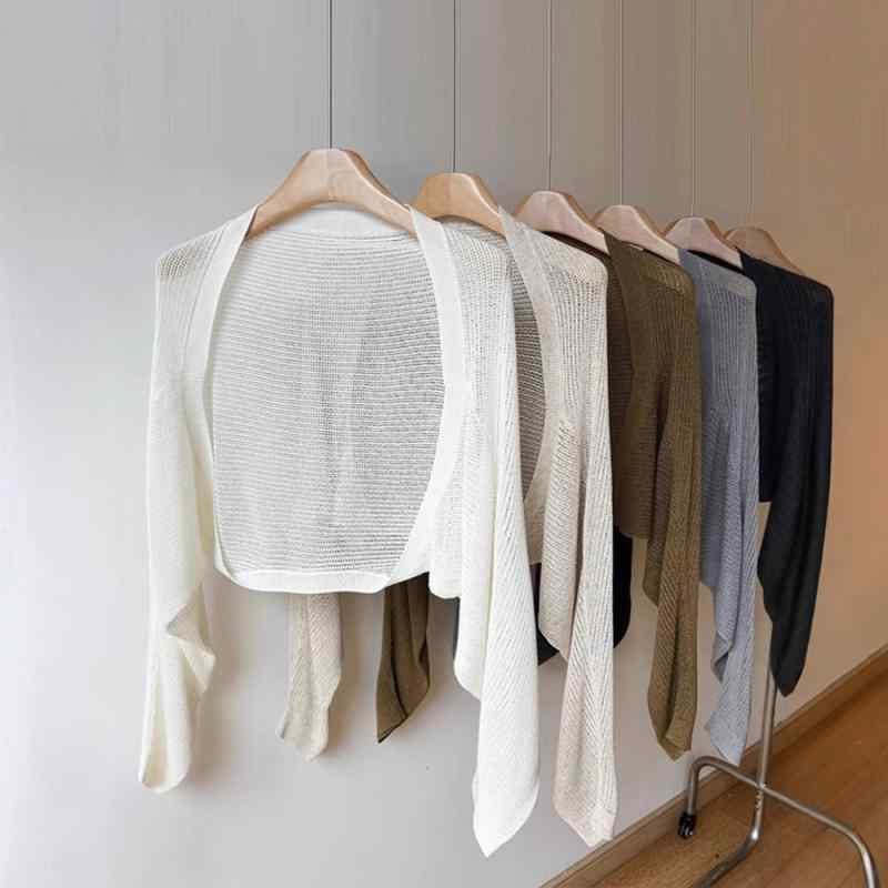 ・カテゴリ: セーター、ニット・スタイル: オフィスカジュアル・アイテム: カーディガン・主な素材: 天爽リネン・柄: 無地・厚さ: 薄手・シルエット: ゆったり・袖タイプ: レギュラー・ネックライン: ノーカラー・袖丈: 長袖・デザイン: 透かし編み・前立て: ボタンなし・着用方法: ショール・カラー展開: ブラック、カーキ、グレー、ライトグレー、ホワイト、オフホワイト・サイズ展開: フリーサイズ