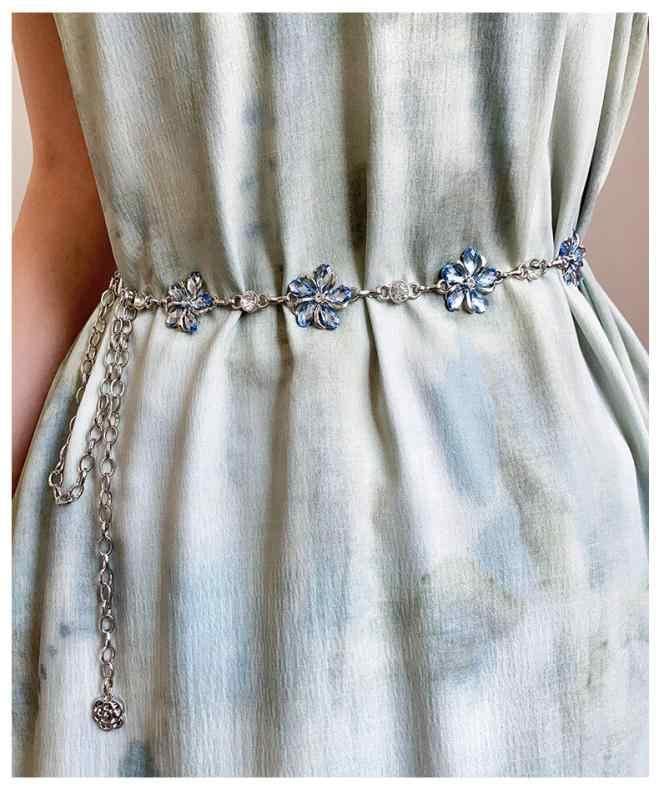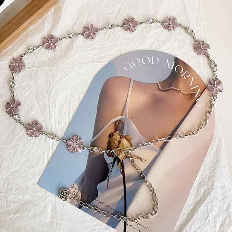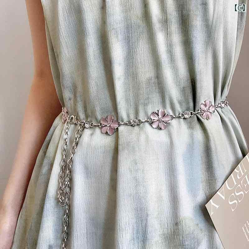 ウエストチェーン レディース フラワーモチーフ 細ベルト 金属製 メタルベルト ワンピース スカート シャツ ブラウス ニット セーター おしゃれ ファッション小物 華奢見え スタイルアップ オールシーズン 着回し抜群 ブルー ゴールド ピンク