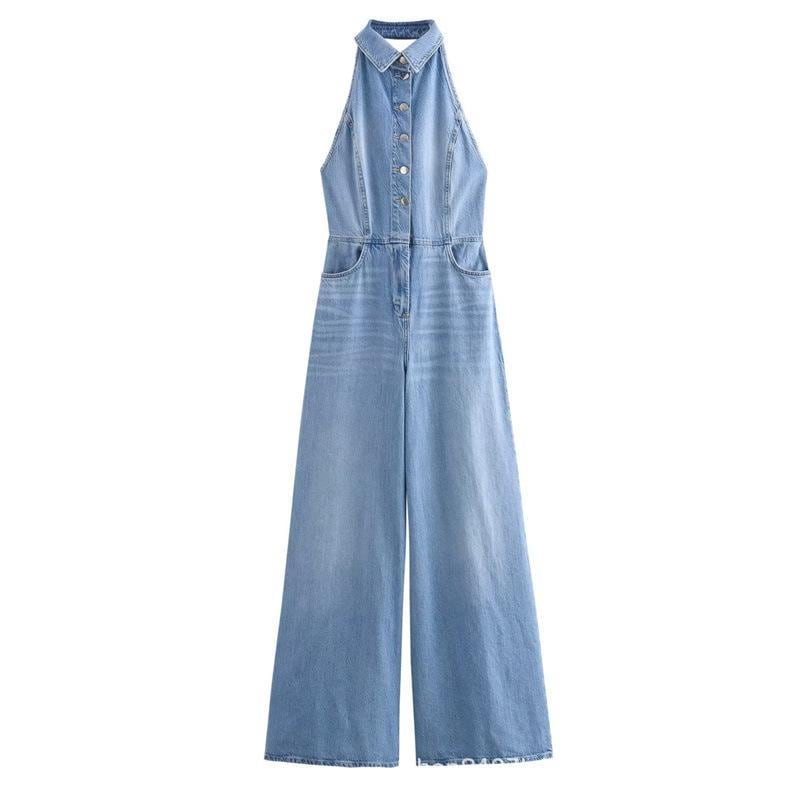 オールインワン レディース デニム ポリエステル ノースリーブ バックオープン ハイウエスト ゆったり 無地 カジュアル 欧米風 ストリートファッション ロング丈