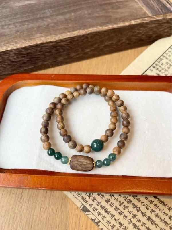 数珠 ブレスレット ユニセックス 伽羅沈香 6mm玉 二連 緑檀 翡翠 レトロ 上品 ハンドメイド 高級感 天然木 天然石 お守り 開運 普段使い