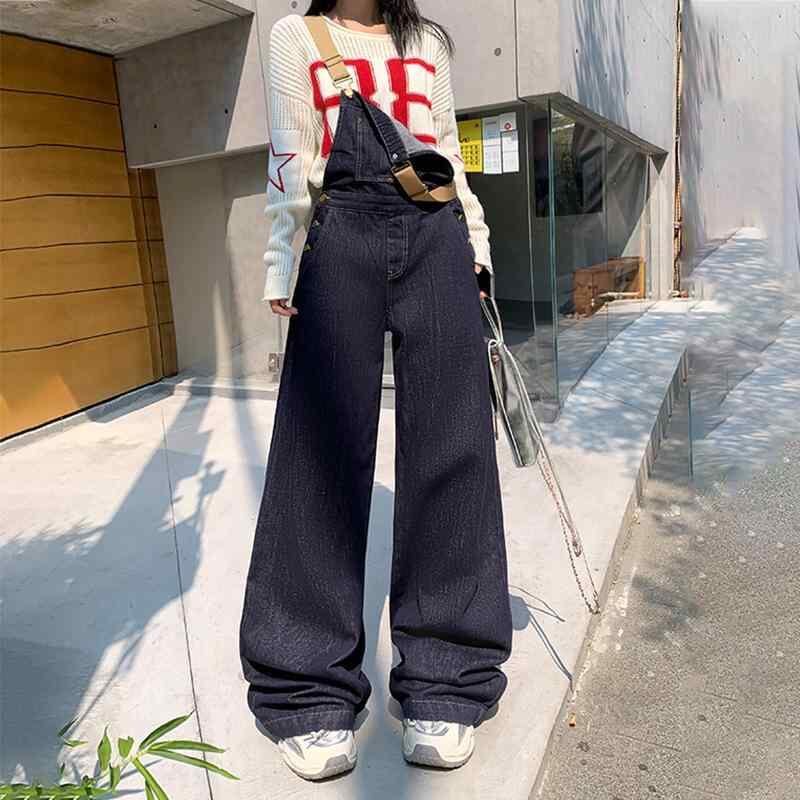 サロペット レディース ダークブルー デニム ハイウエスト スタイルアップ ストレート ゆったり フルレングス オールインワン 綿混 ポケット付き 中厚手 カジュアル リラックスフィット