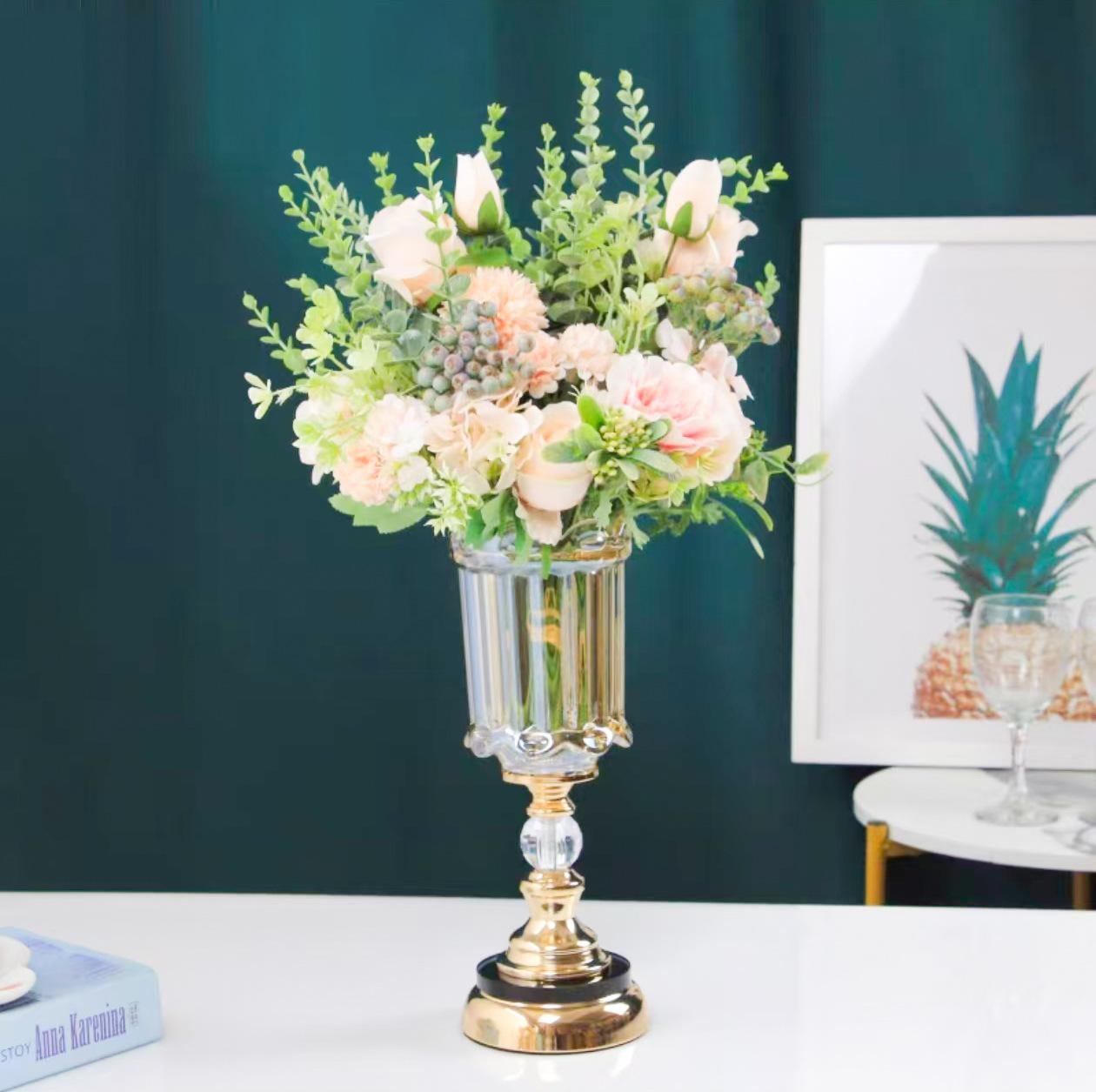 花瓶 欧風 高級感 クリスタルガラス製 金属製 万華鏡デザイン ダイニングテーブル 食卓 リビング 居間 レストラン 店舗 装飾品 造花 ドライフラワー 生け花器 ブラック ゴールド ブロンズカラー 飾り
