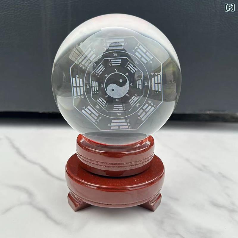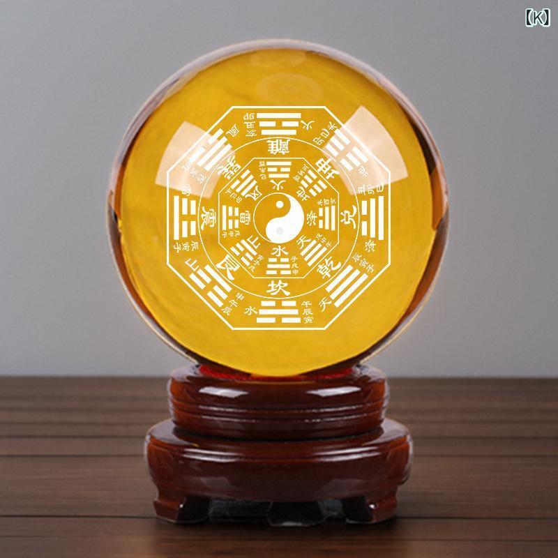 水晶玉 置物 太極八卦 内彫刻 煙水晶 風水 インテリア 室内装飾 リビング 玄関 寝室 オフィス デスク 卓上 新築祝い 喬遷祝い アジアン 和風モダン 木製台座付き ホワイト イエロー ブラウン