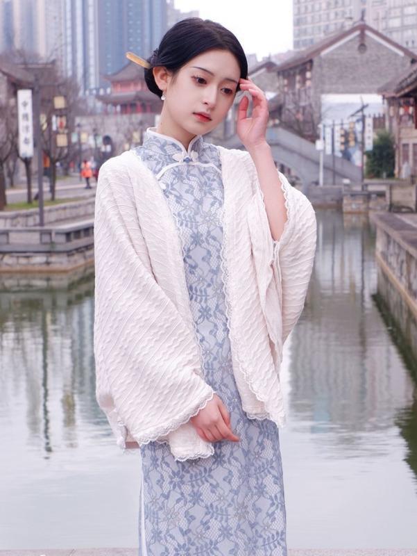 羽織 レディース レトロ 文芸風 エレガント クラシック チャイナドレス ケープ ポンチョ カーディガン ショール 無地 レース フリル 春 秋 着回し 万能 レギュラー丈