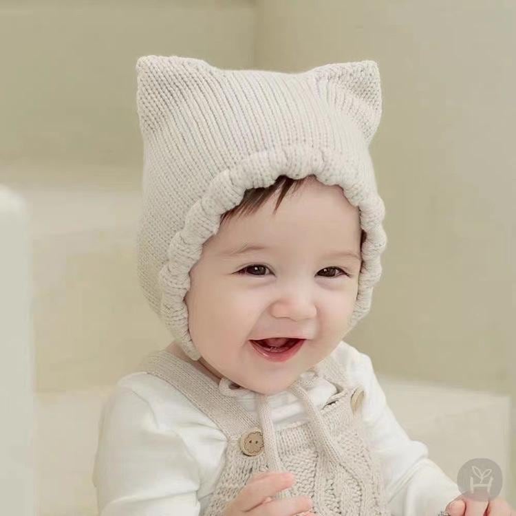 ニット帽 ベビー 男の子 女の子 ツノ付き 角付き かわいい 耳あて 耳付き 防寒 保温 暖かい アクリル素材 新生児 乳幼児 0歳 1歳 冬用 お出かけ アイボリー ホワイト キャメル