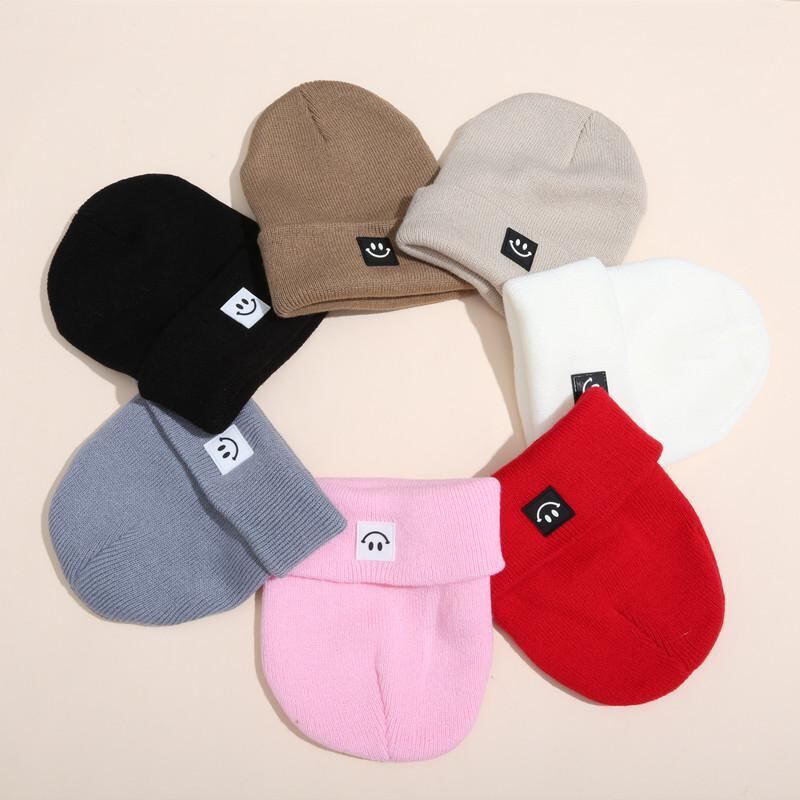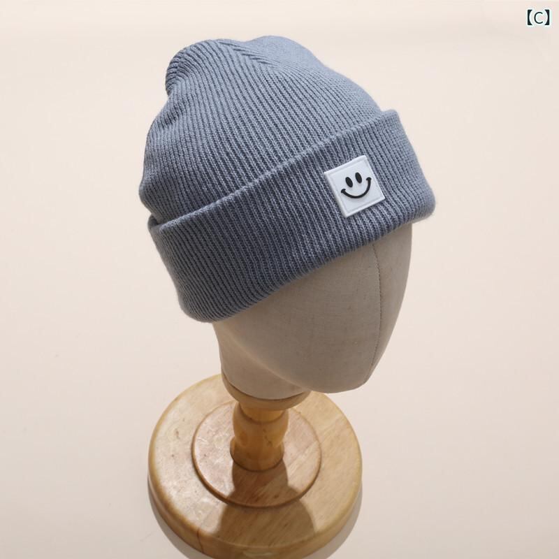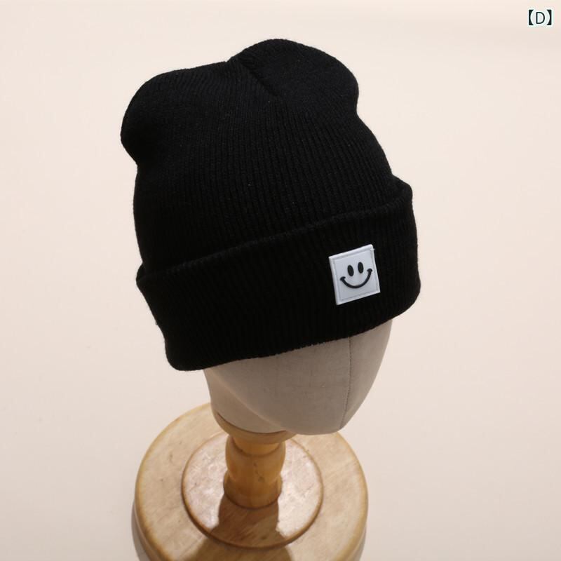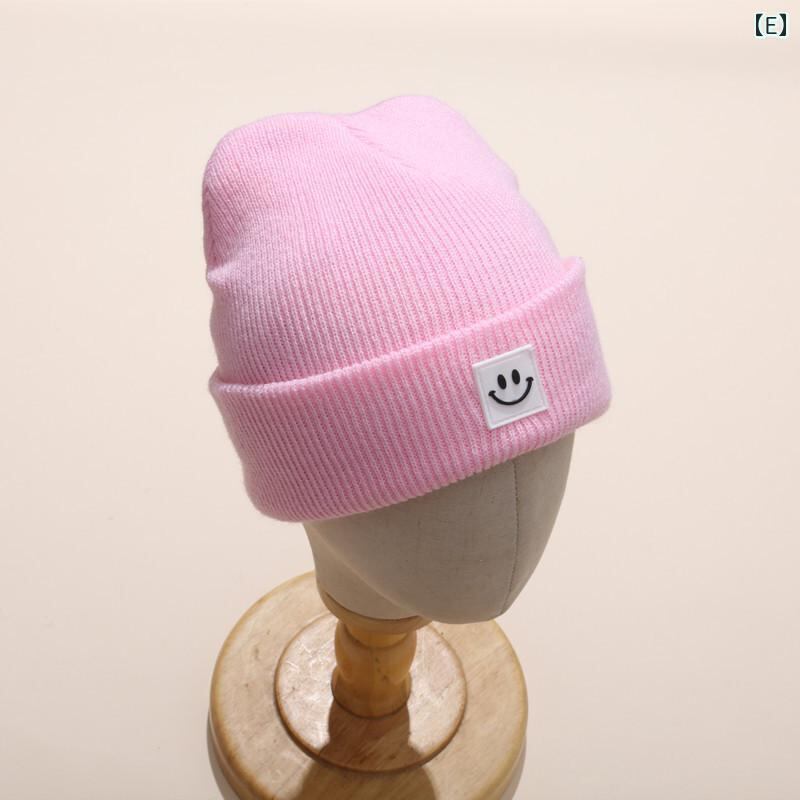 ニット帽 ベビー キッズ 男の子 女の子 秋冬 かわいい ニコちゃん スマイル あったか 保温 防寒 耳あて 耳保護 アクリル ふわふわ カジュアル 普段使い お出かけ ホワイト ブラック ピンク