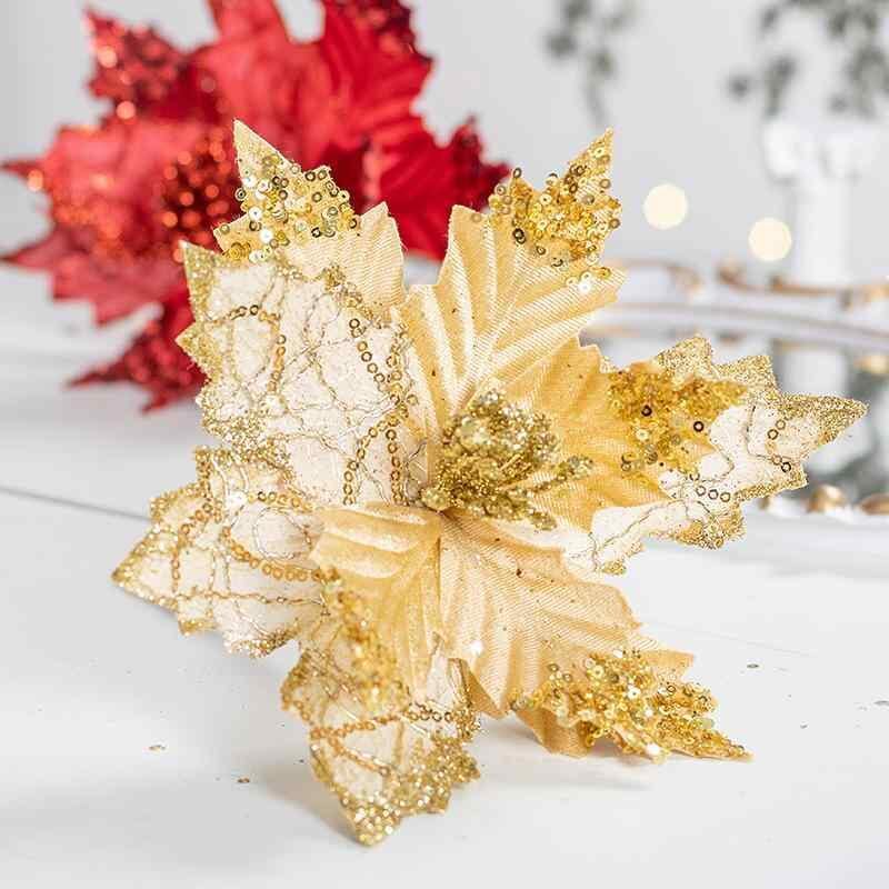 クリスマス飾り ゴールド レッド 21cm キラキラ スパンコール クリスマスフラワー ポインセチア風 ベルベット フランネル クリスマスツリー飾り オーナメント 吊り下げ DIY デコレーション